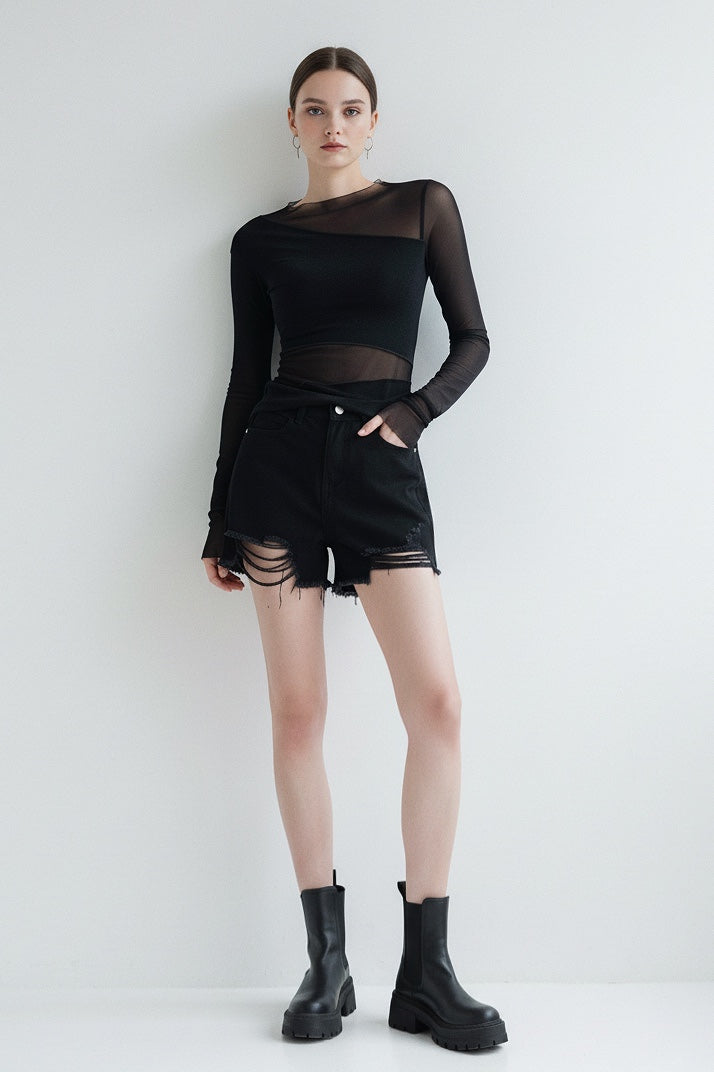 Our Blazing Night top is cut for a skin-tight fit from stretch acetate and paneled with sheer mesh at the neck, shoulders and waist.