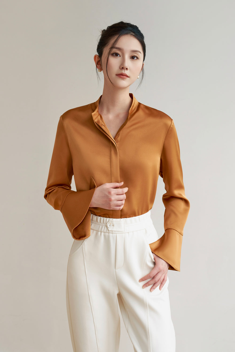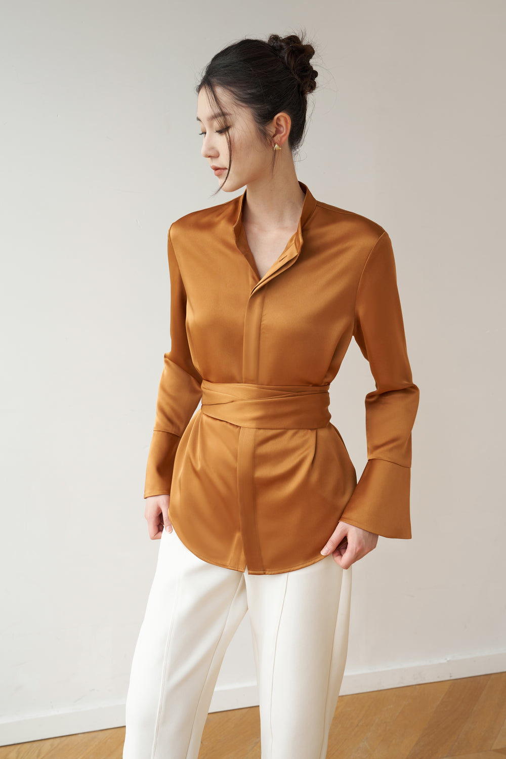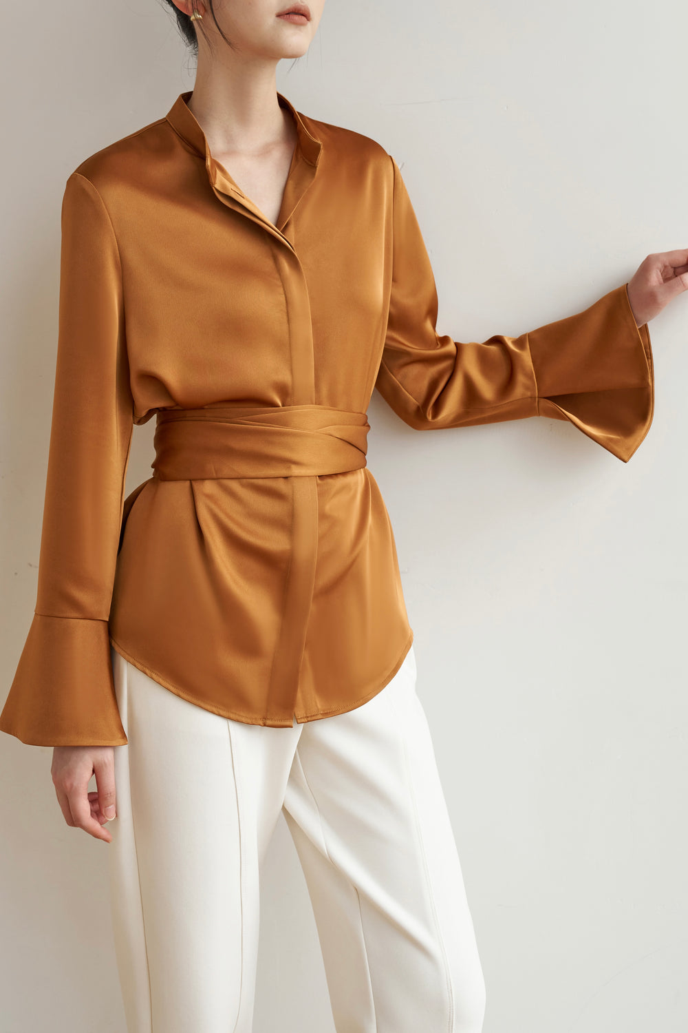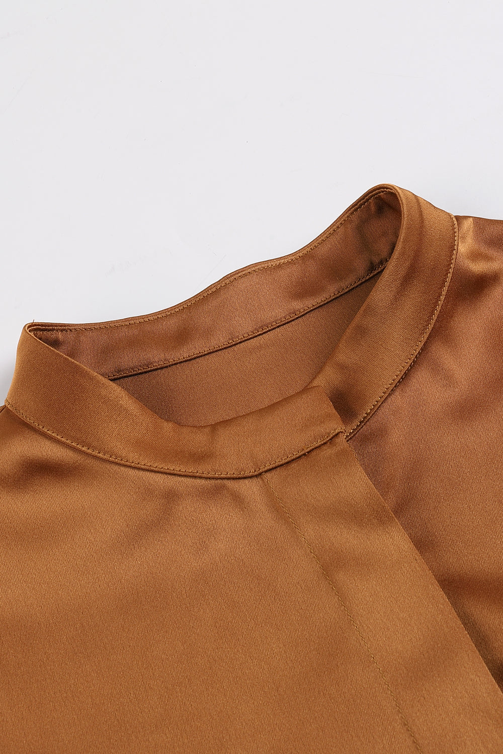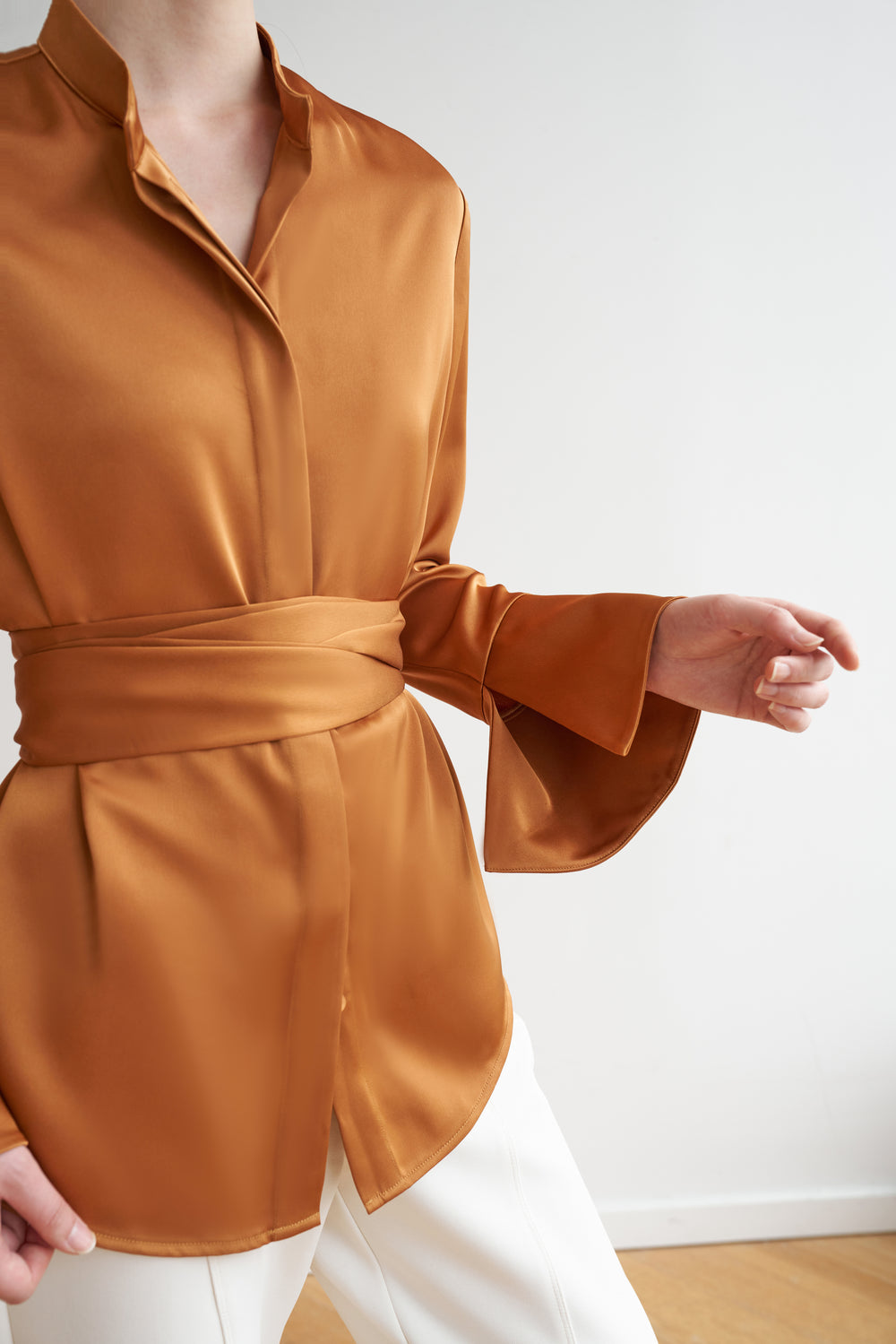 Our elegancy Champagne shirt is cut from fluid satin fabric.