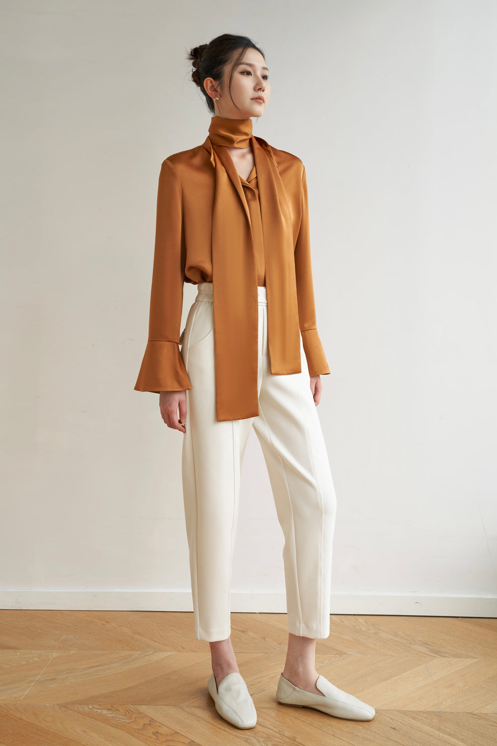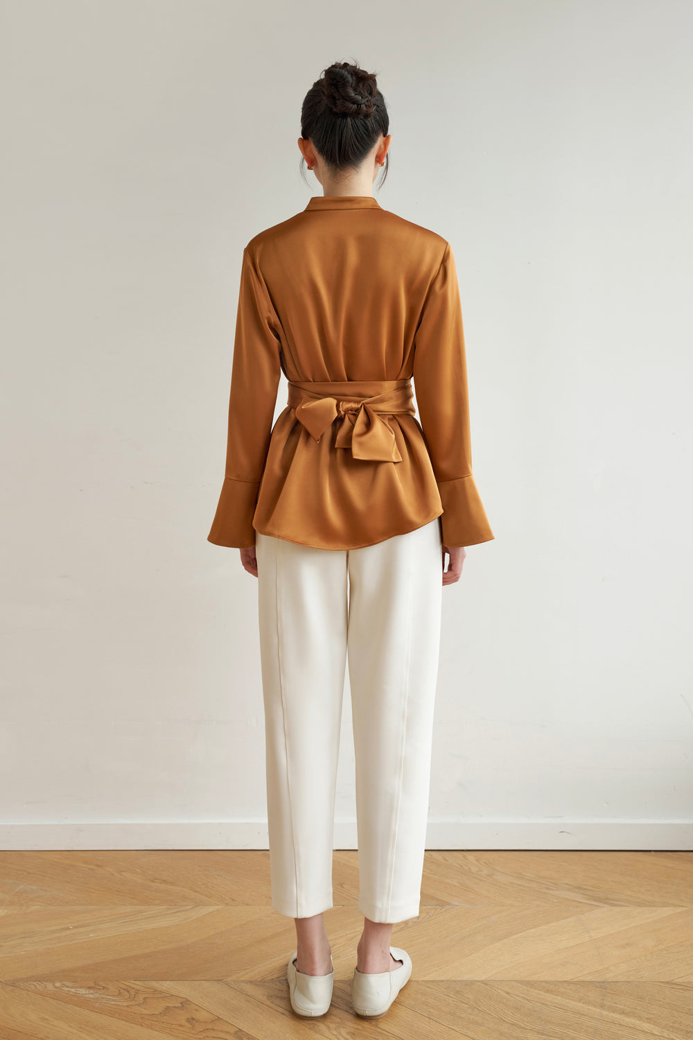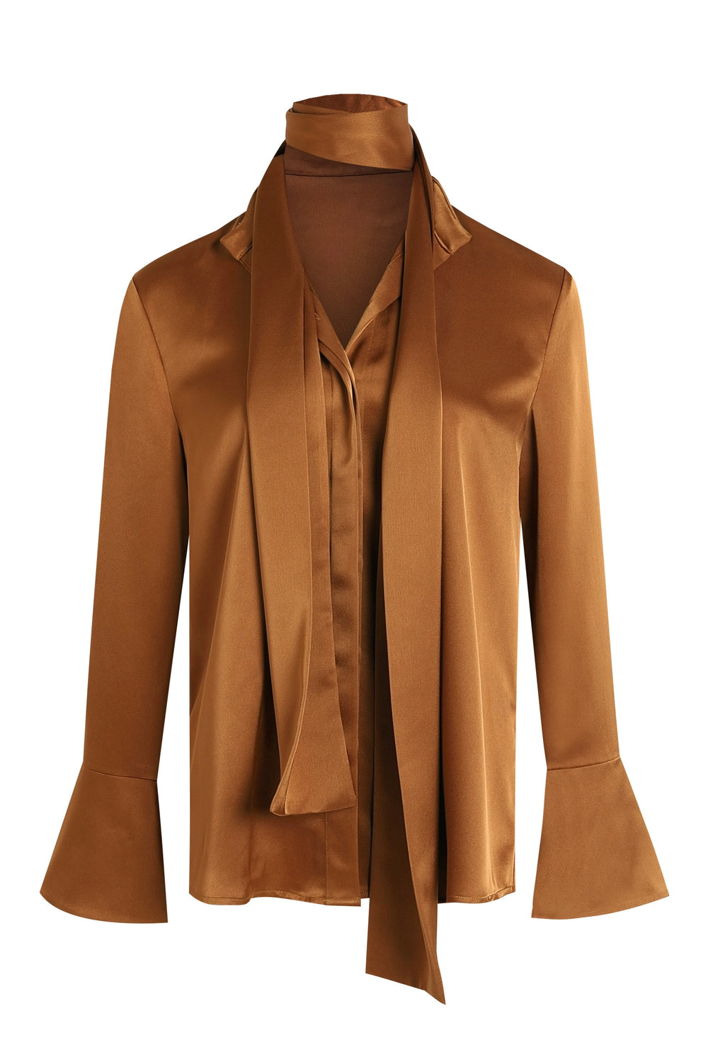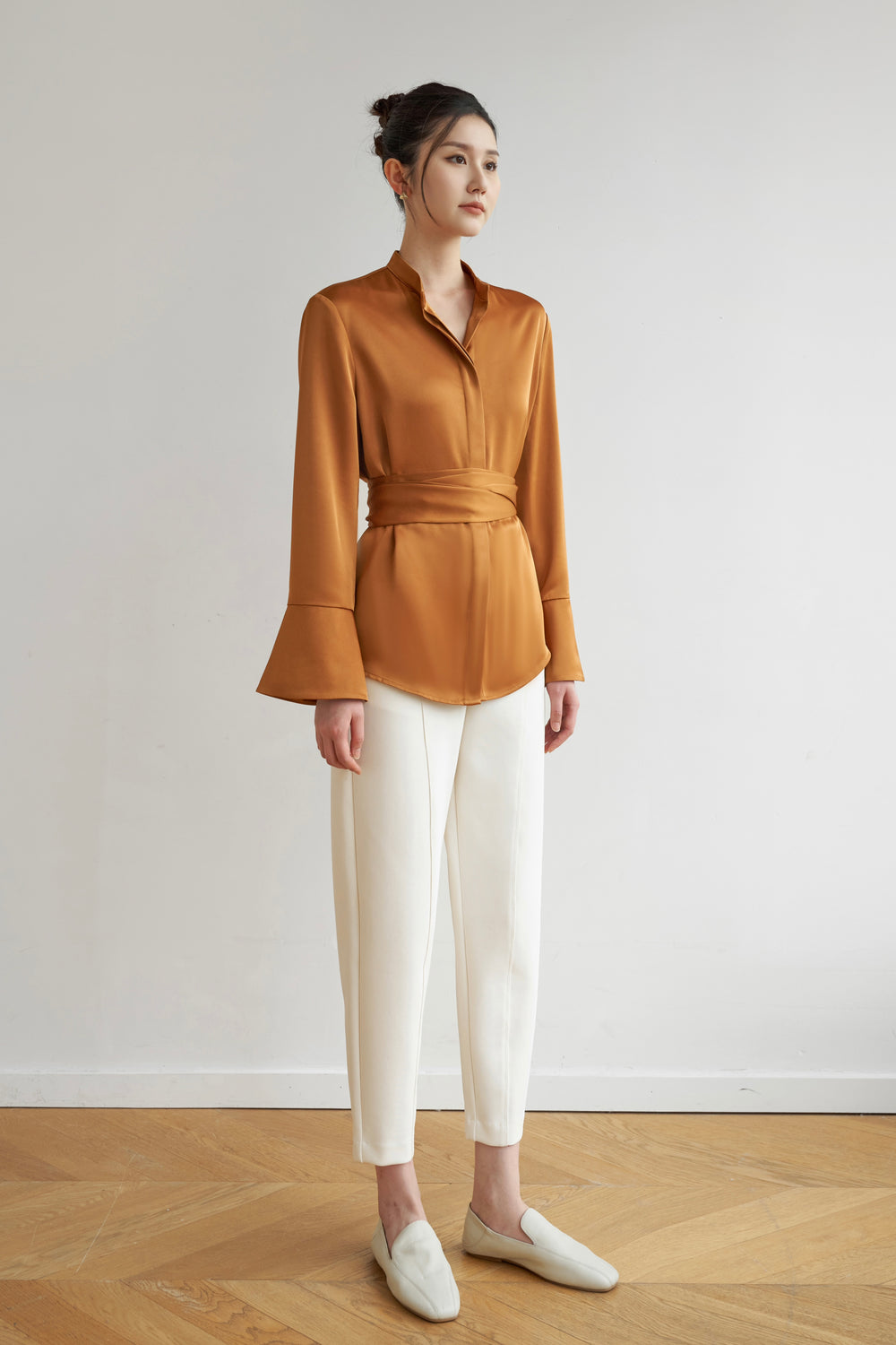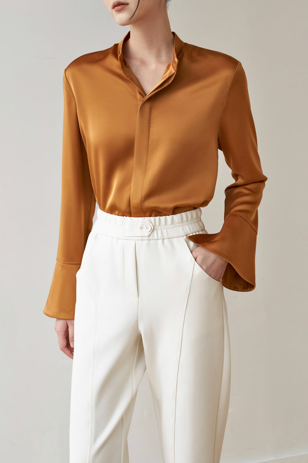 Our elegancy Champagne shirt is cut from fluid satin fabric.