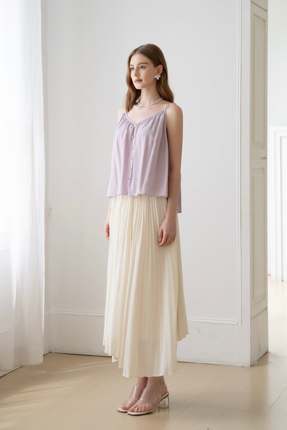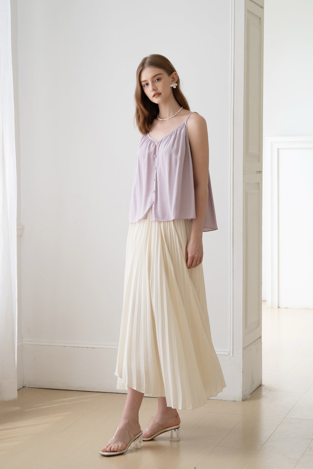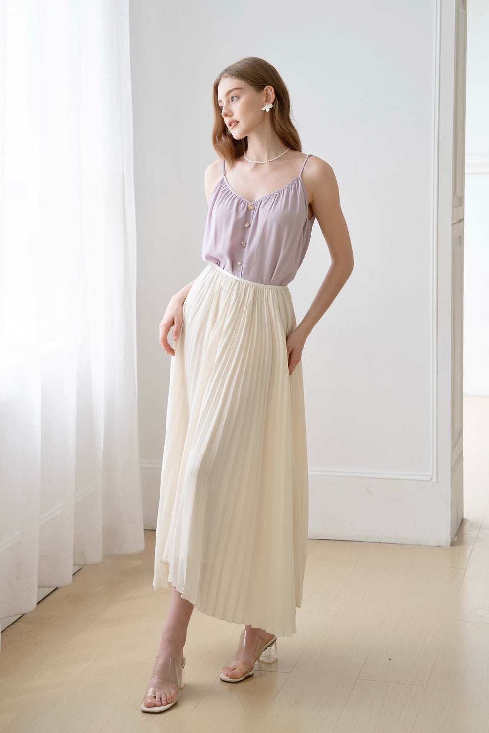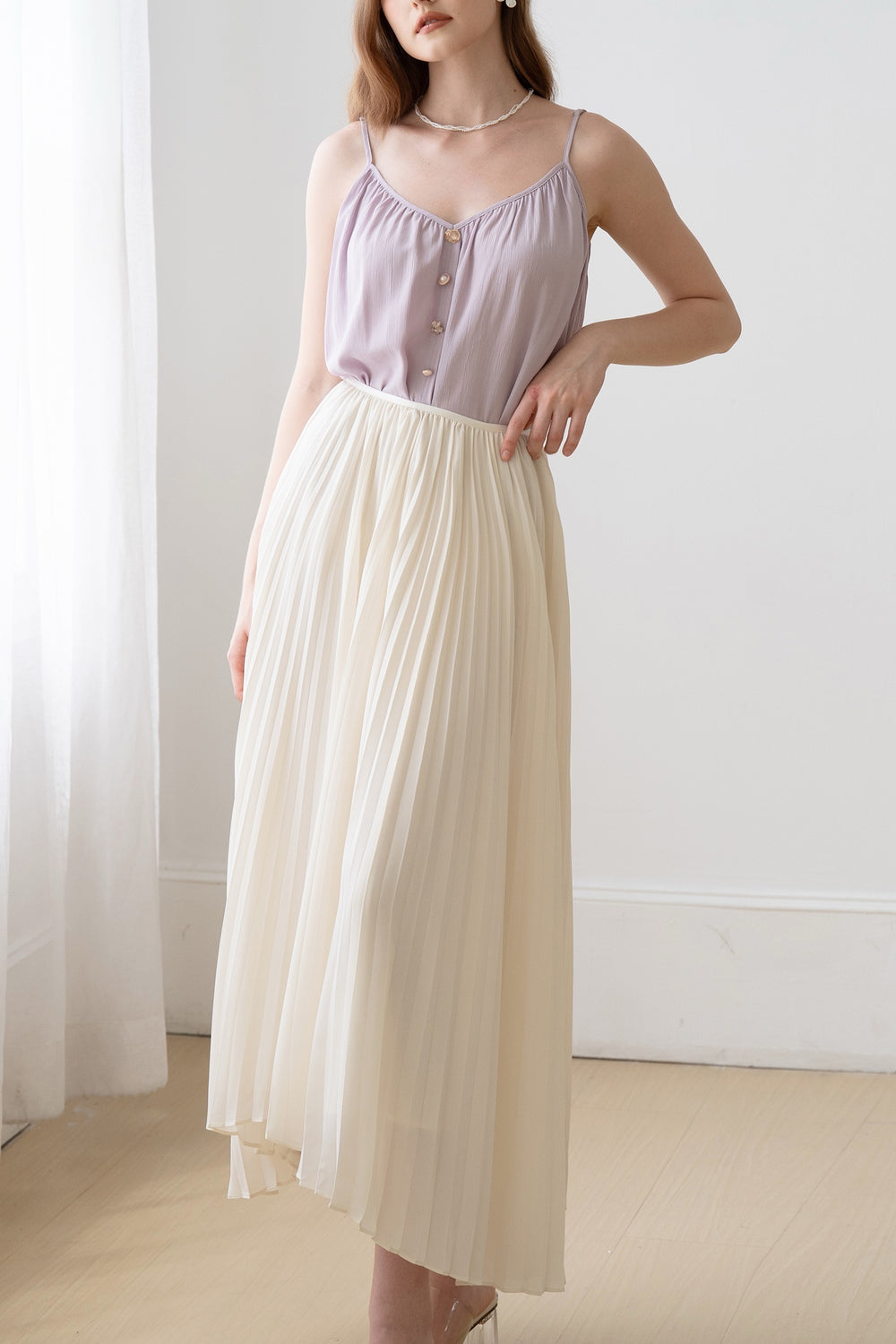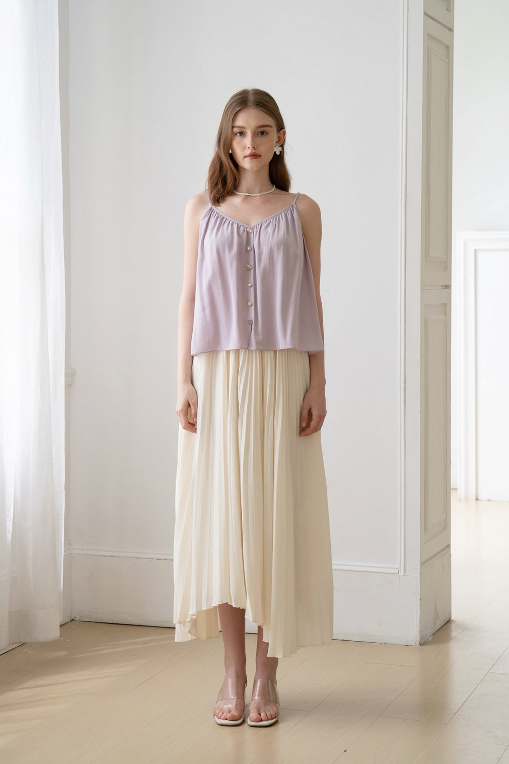 Cut from lightweight chiffon and has sharp hand-pressed pleated with an asymmetric hem.