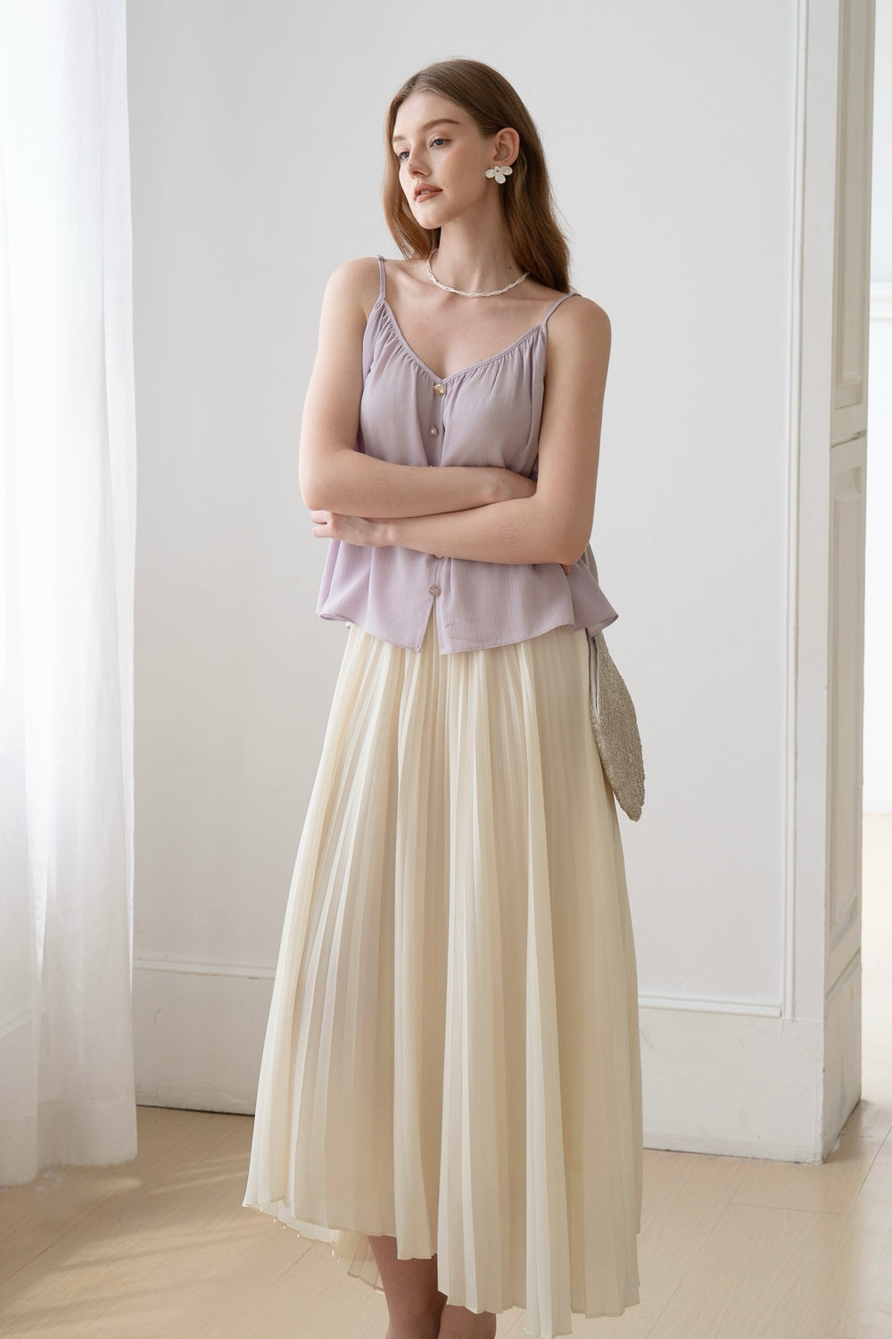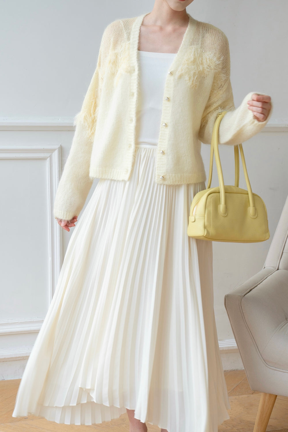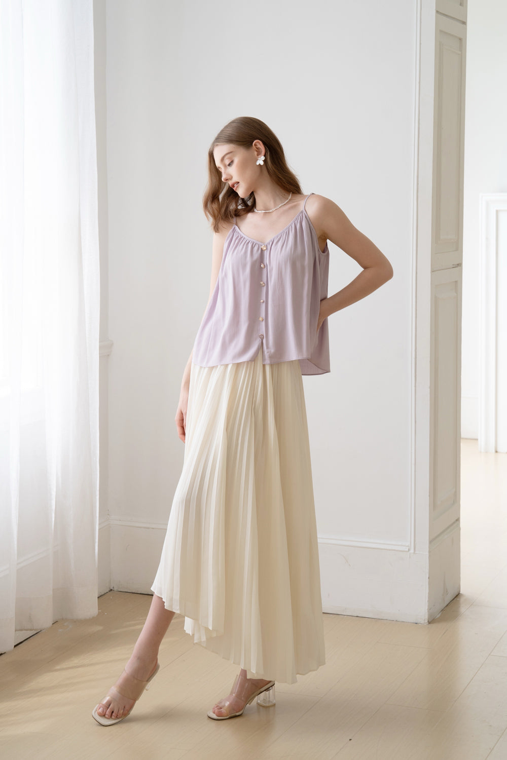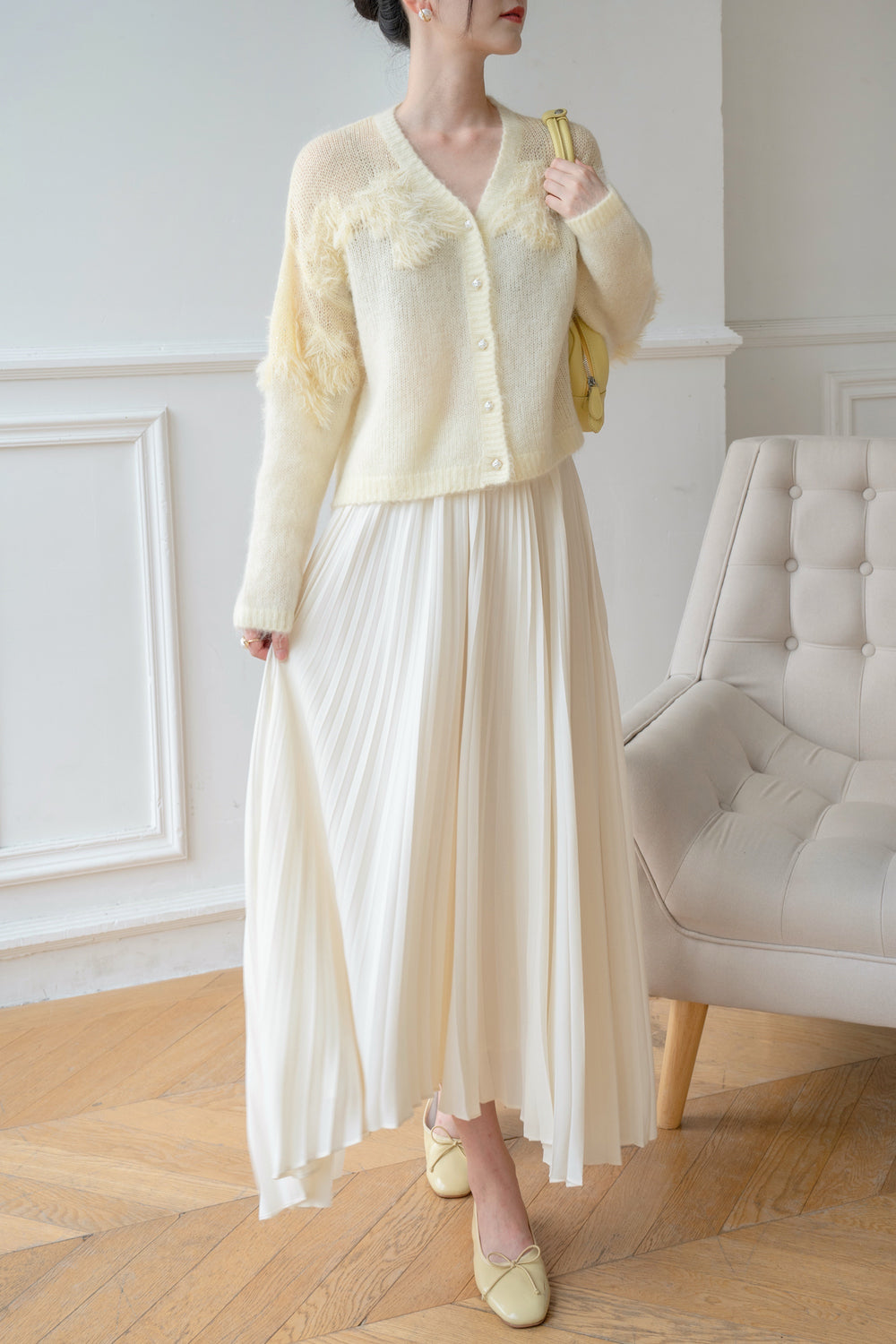 Cut from lightweight chiffon and has sharp hand-pressed pleated with an asymmetric hem.