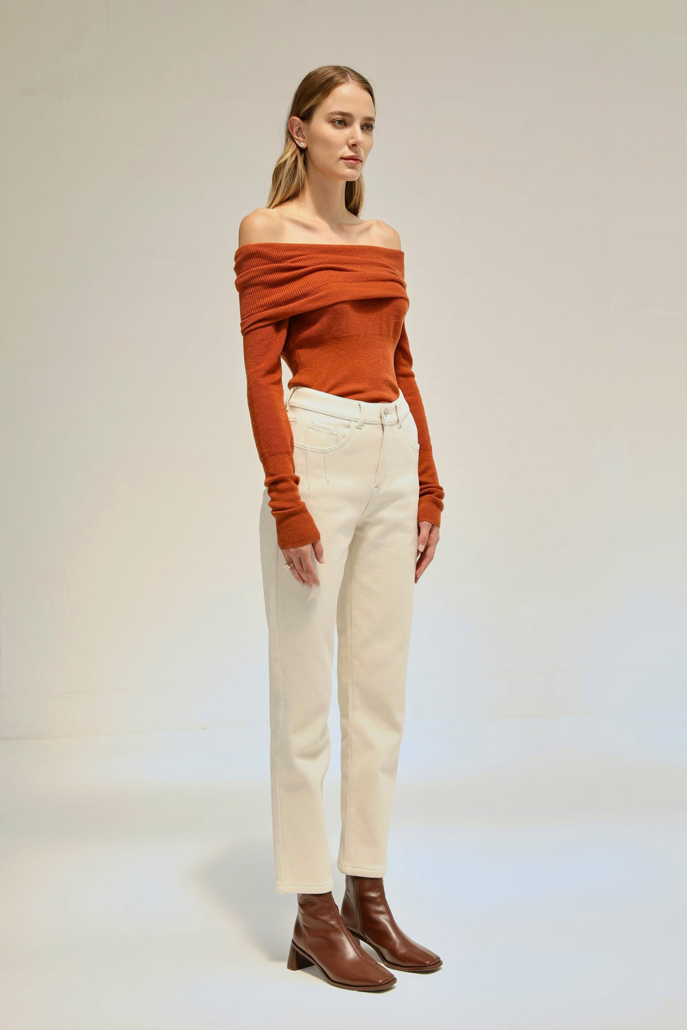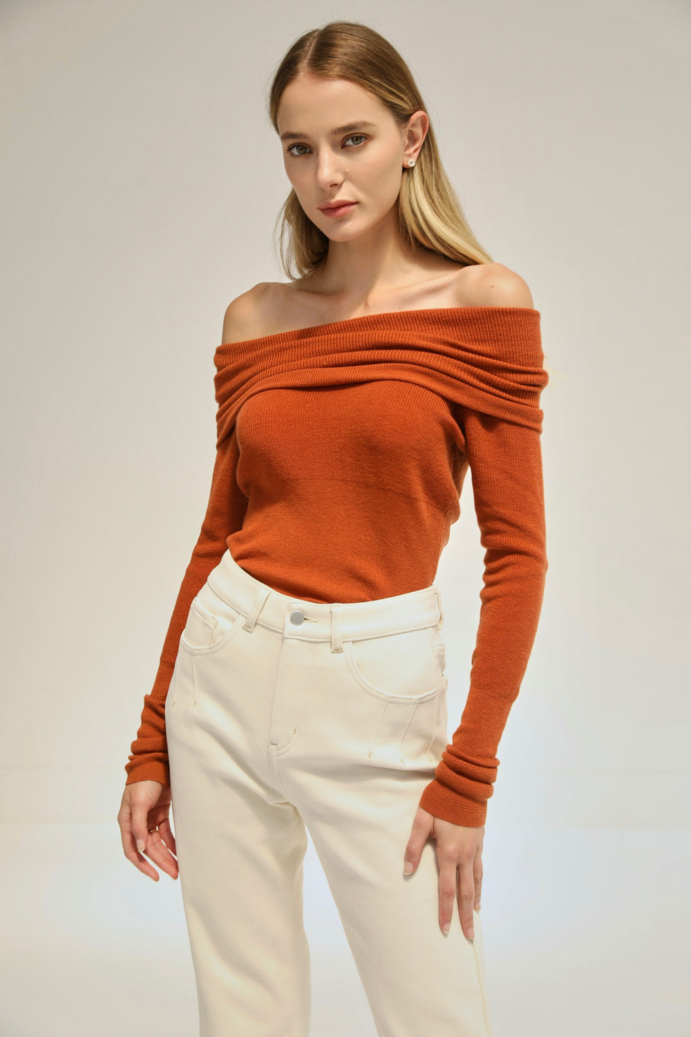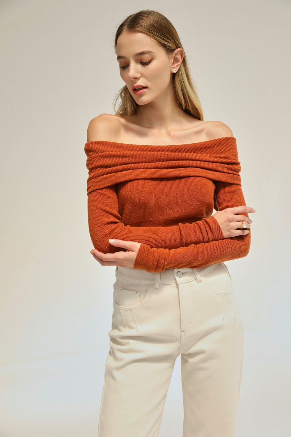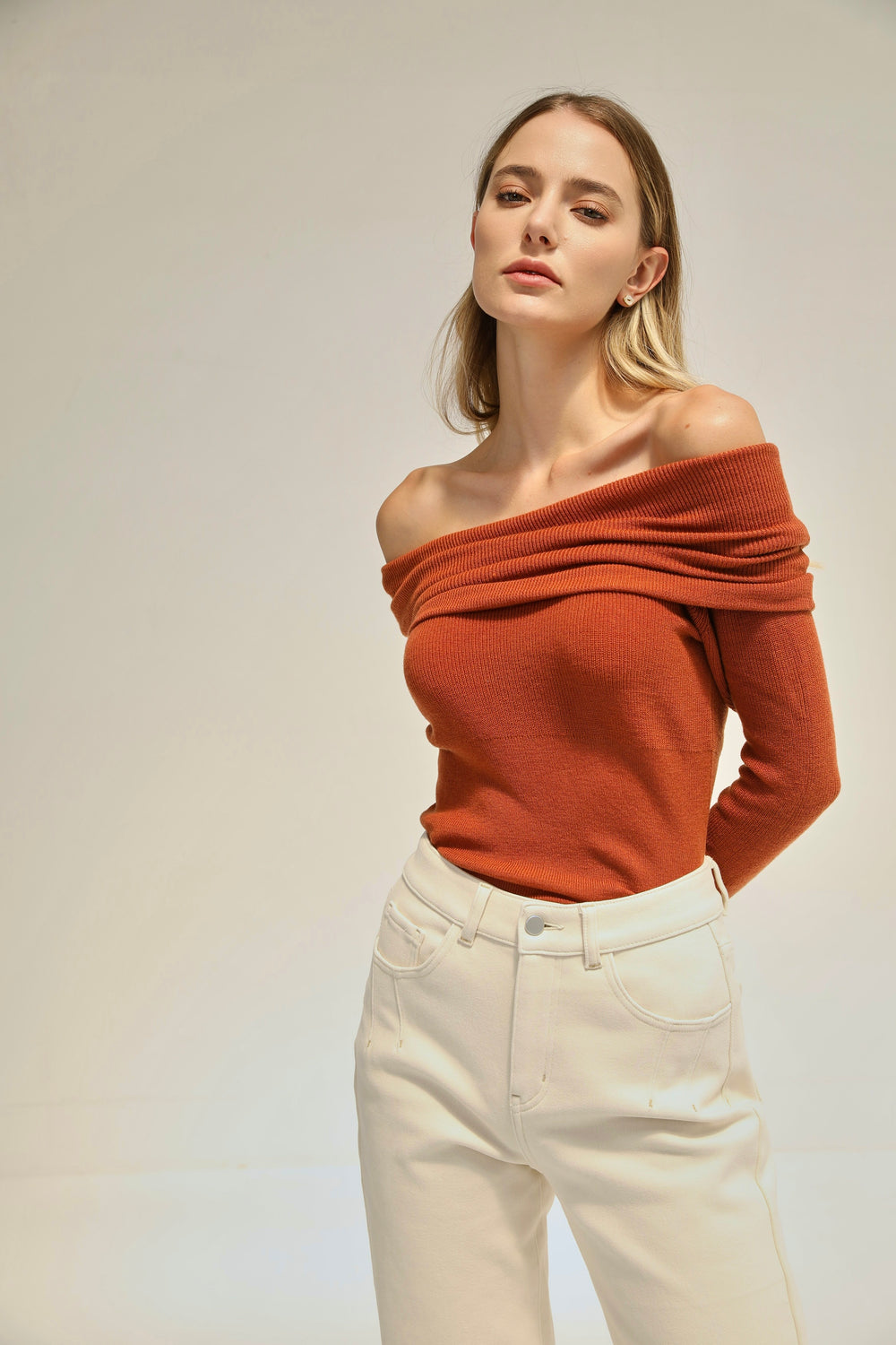 This top can be either worn us a cowl-neck top or pull down as an off the shoulder top