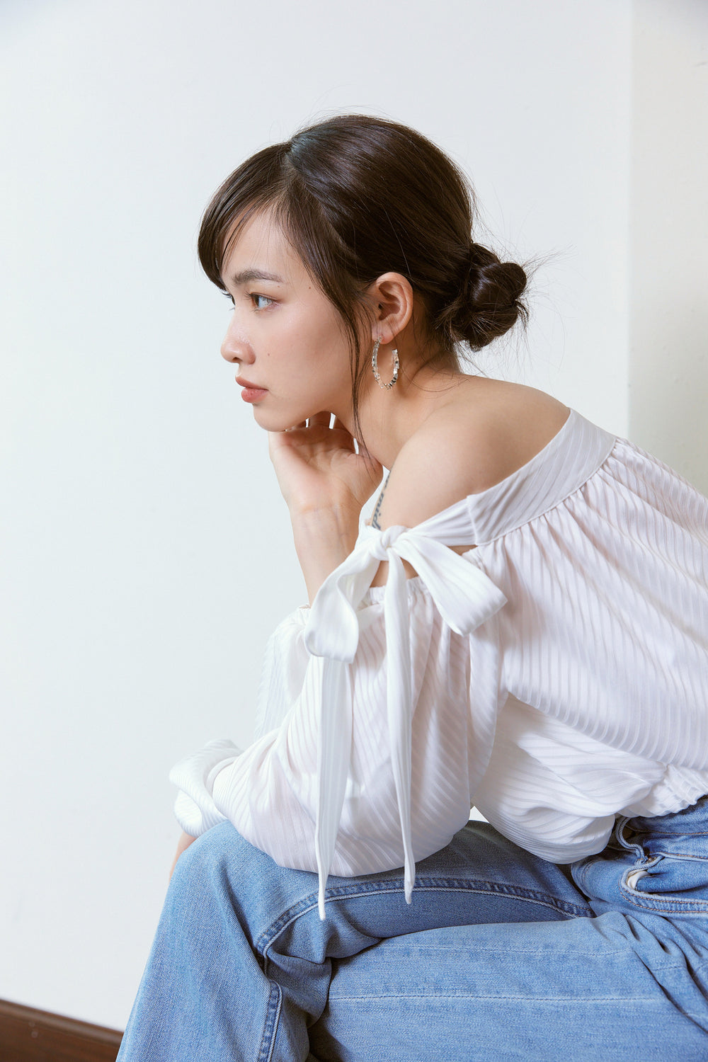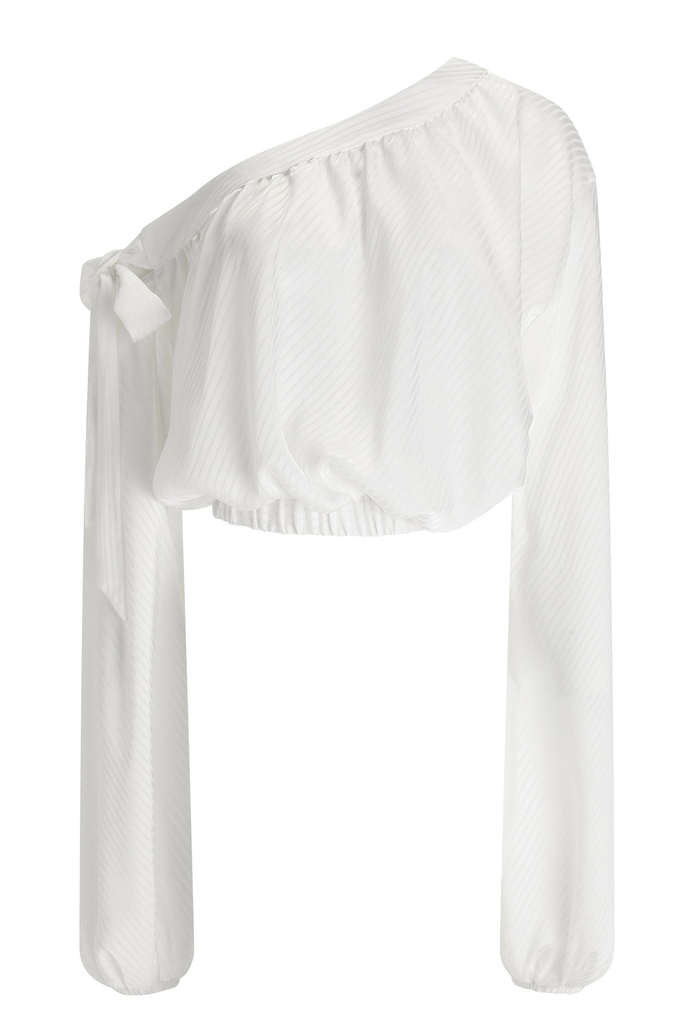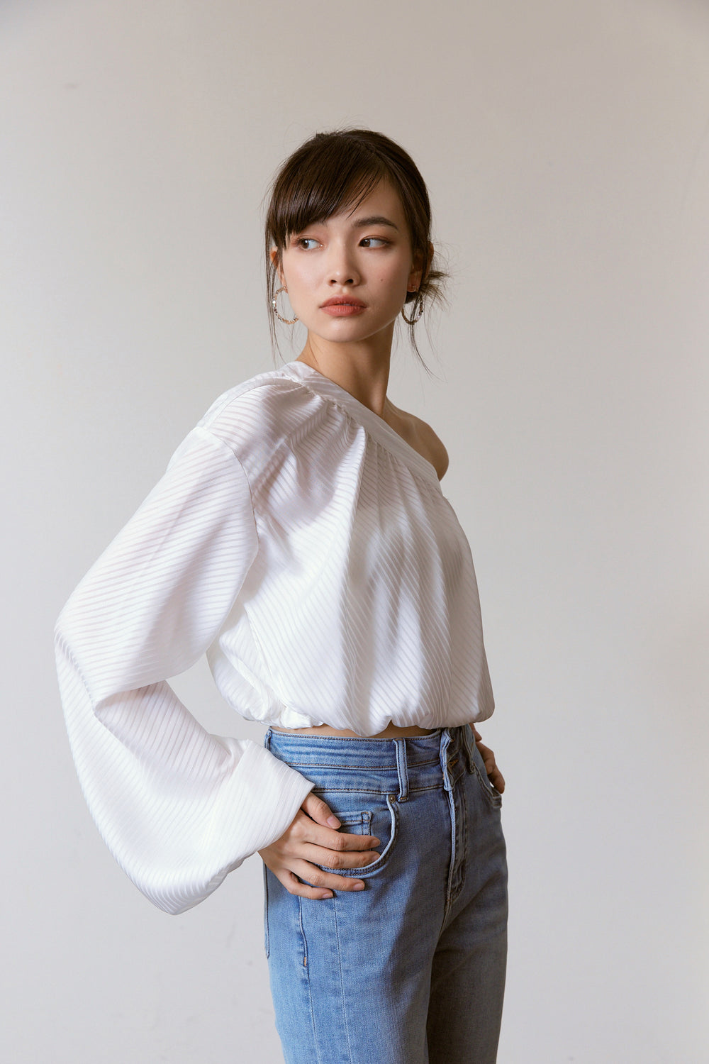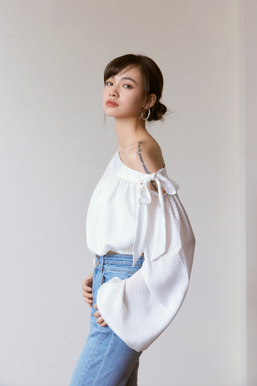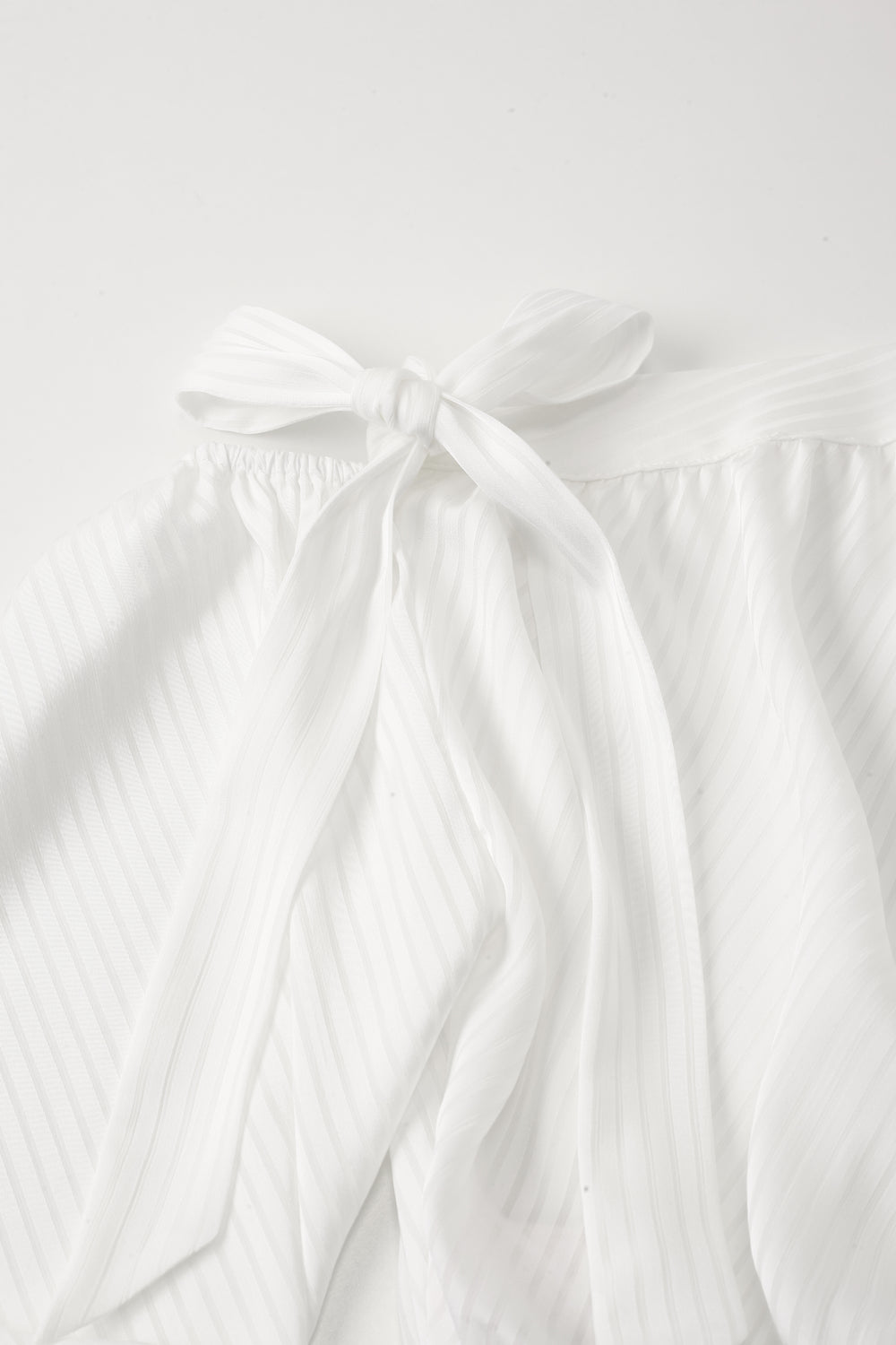 This top is cut on bias from fluid striped satin in a slightly loose silhouette