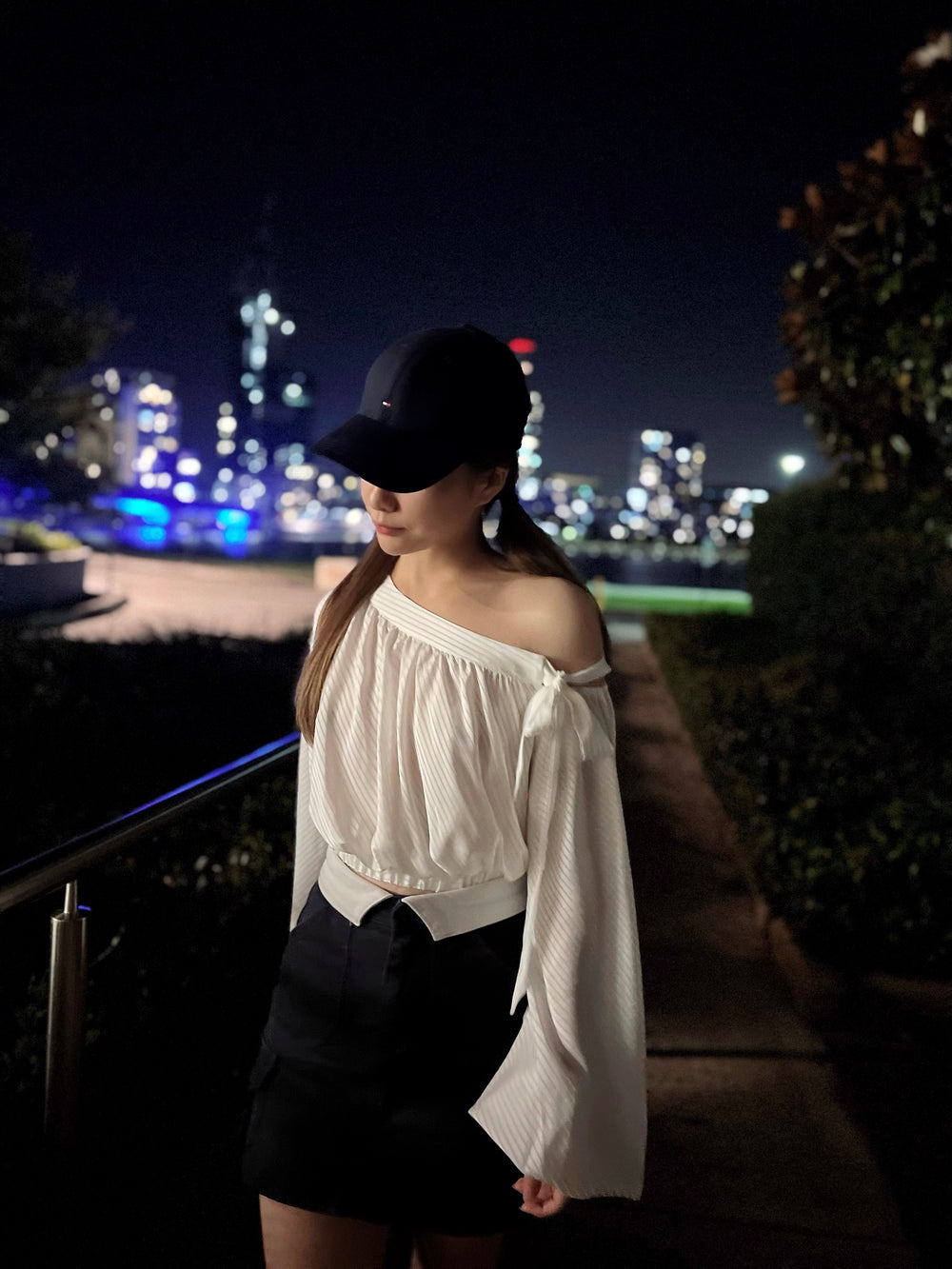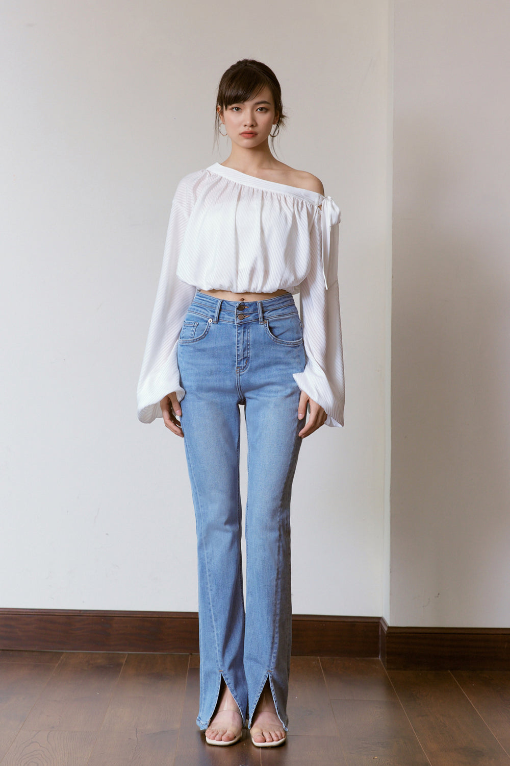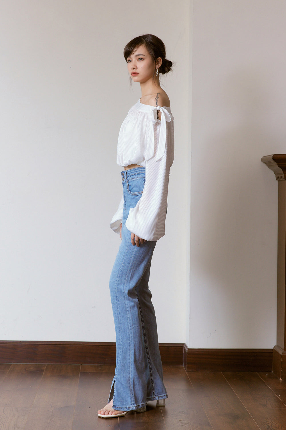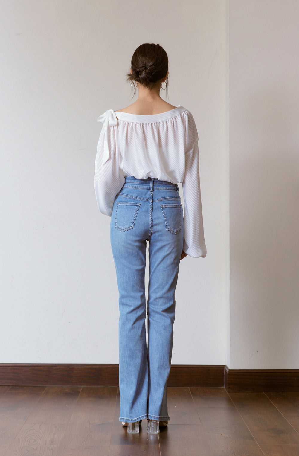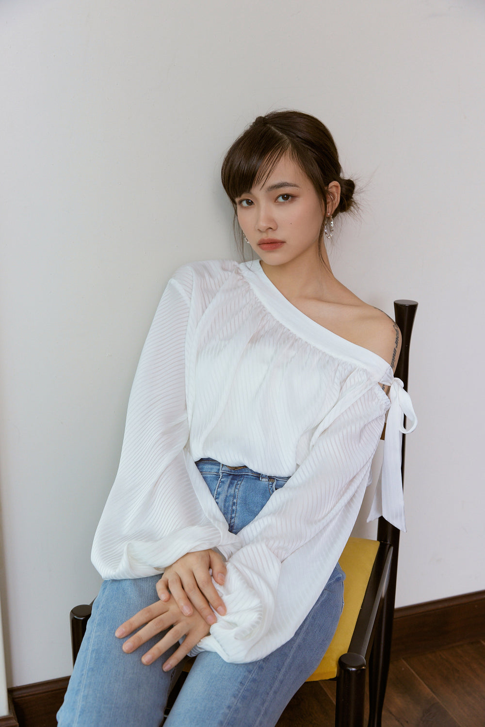This top is cut on bias from fluid striped satin in a slightly loose silhouette