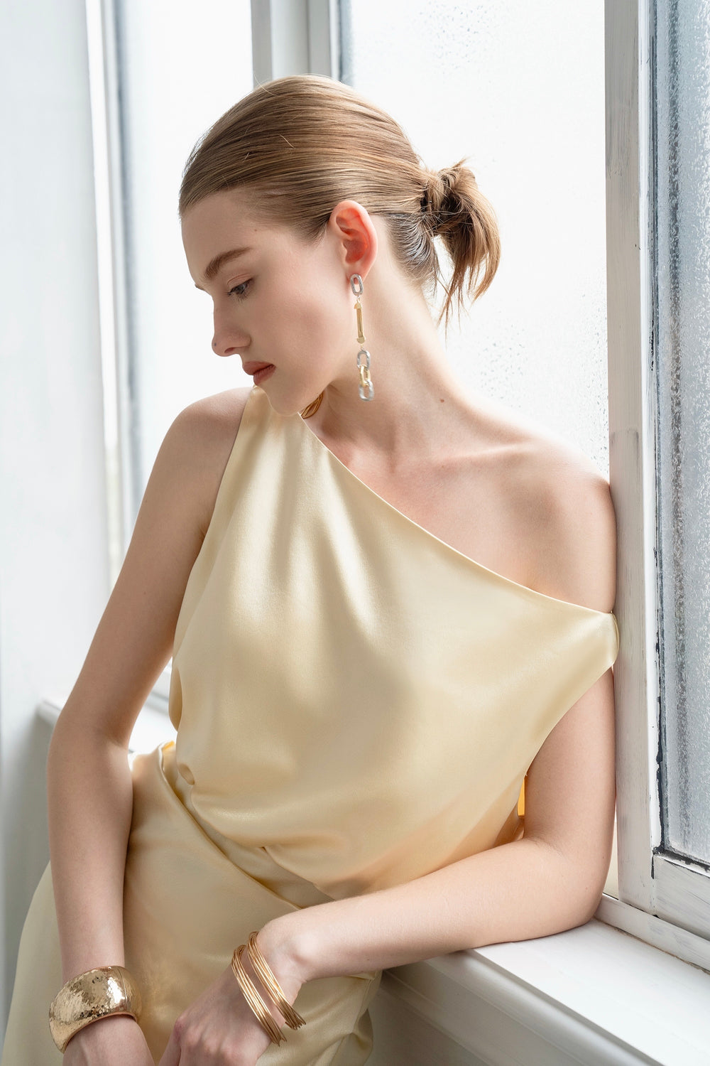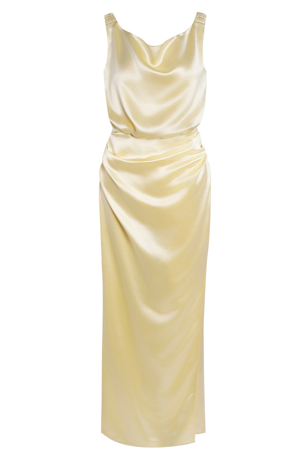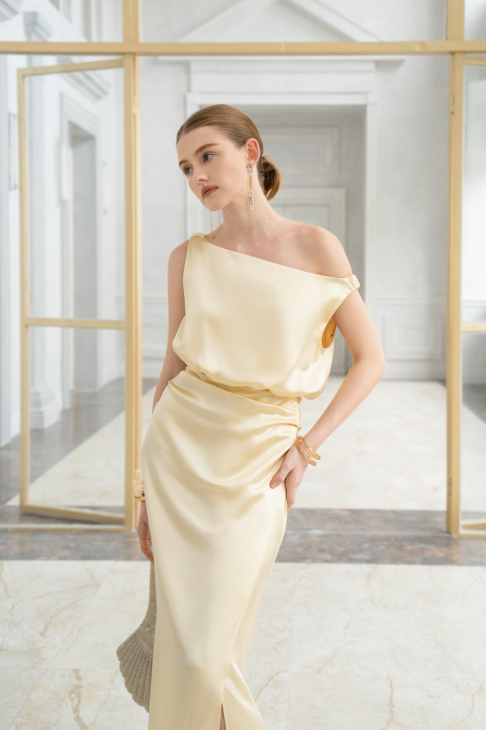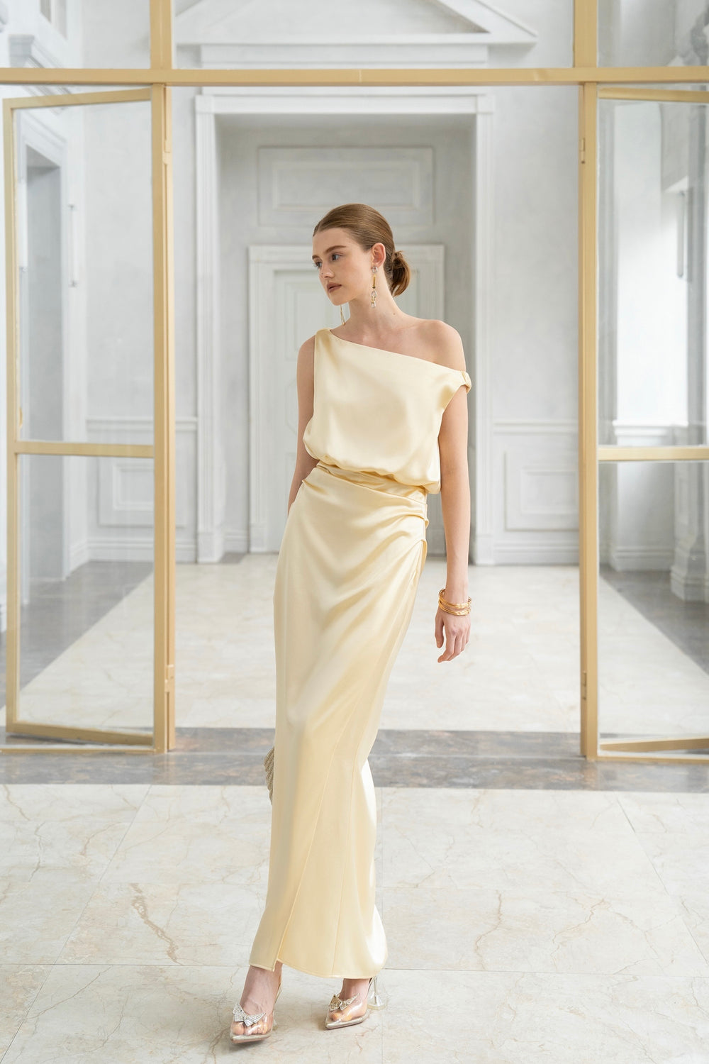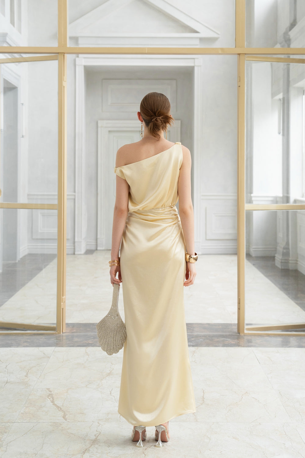This elegant dress draws inspiration from 1990s evening gowns, evoking the timeless glamour of old Hollywood.