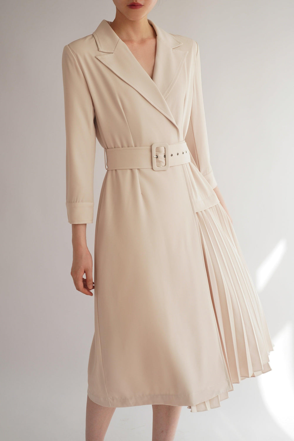 Our Rebecca dress designed with trench coat inspired silhouette and falls to neat pleats that create gentle movement through the skirt.