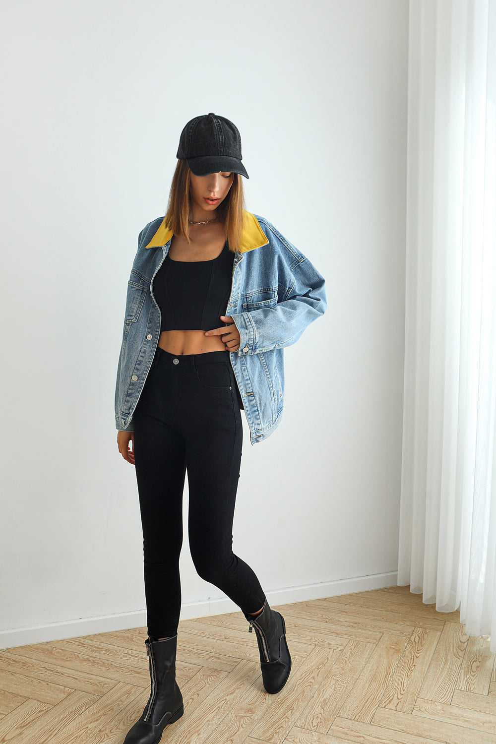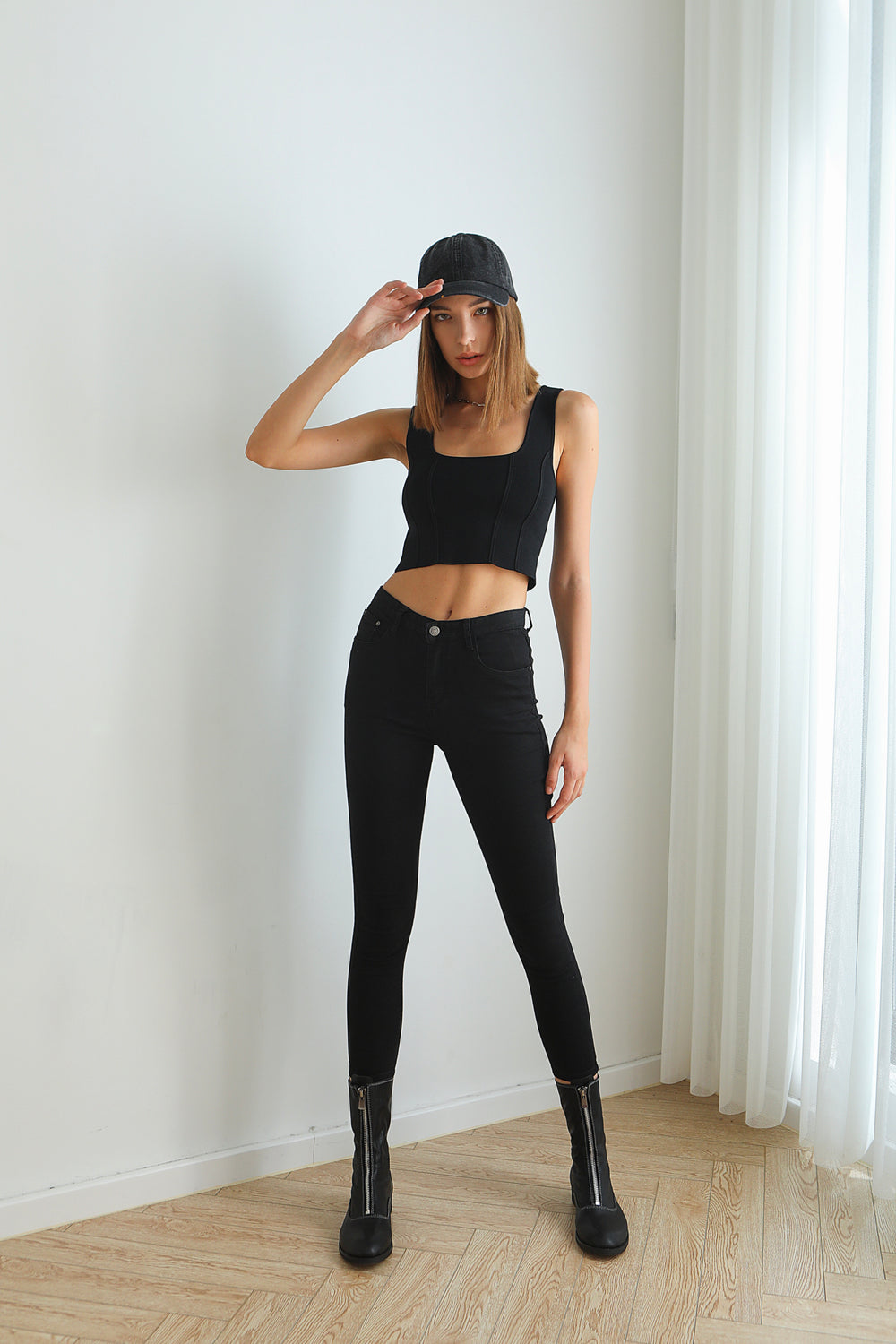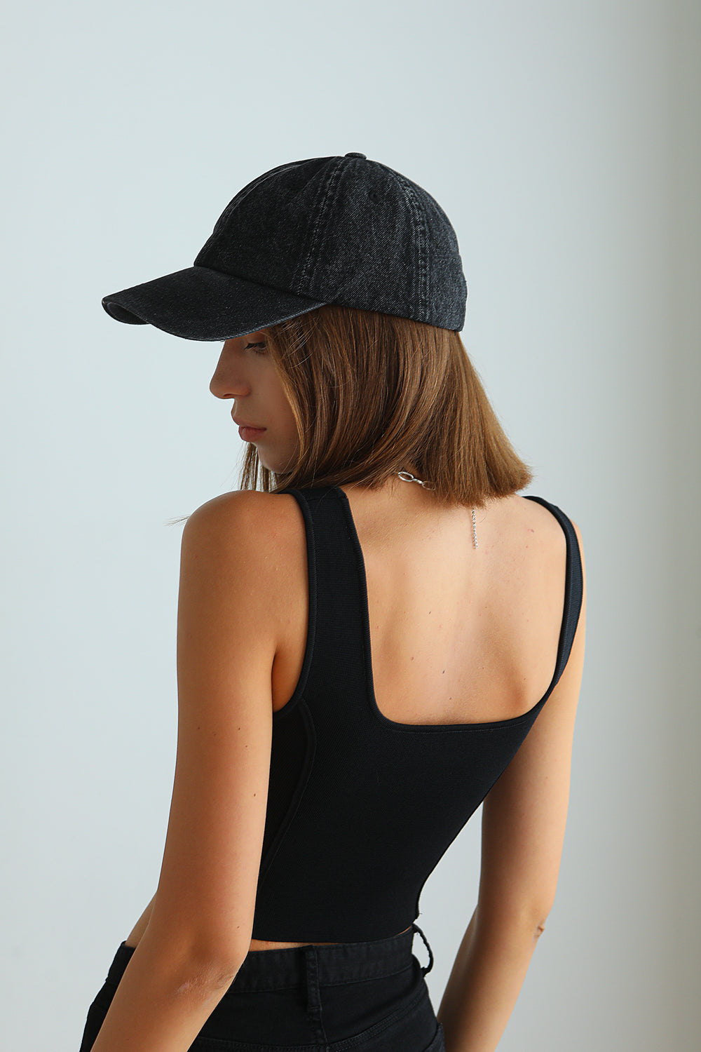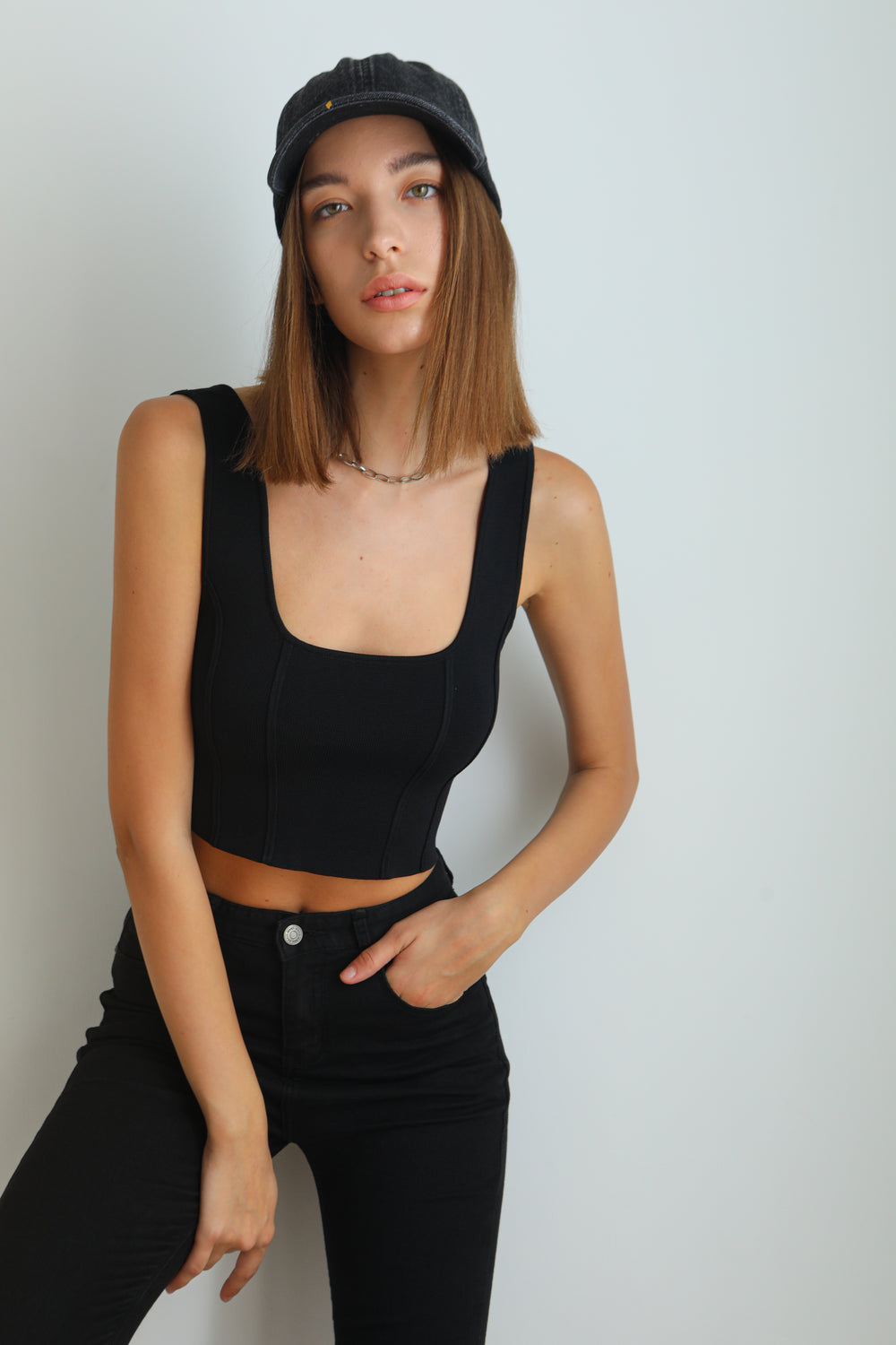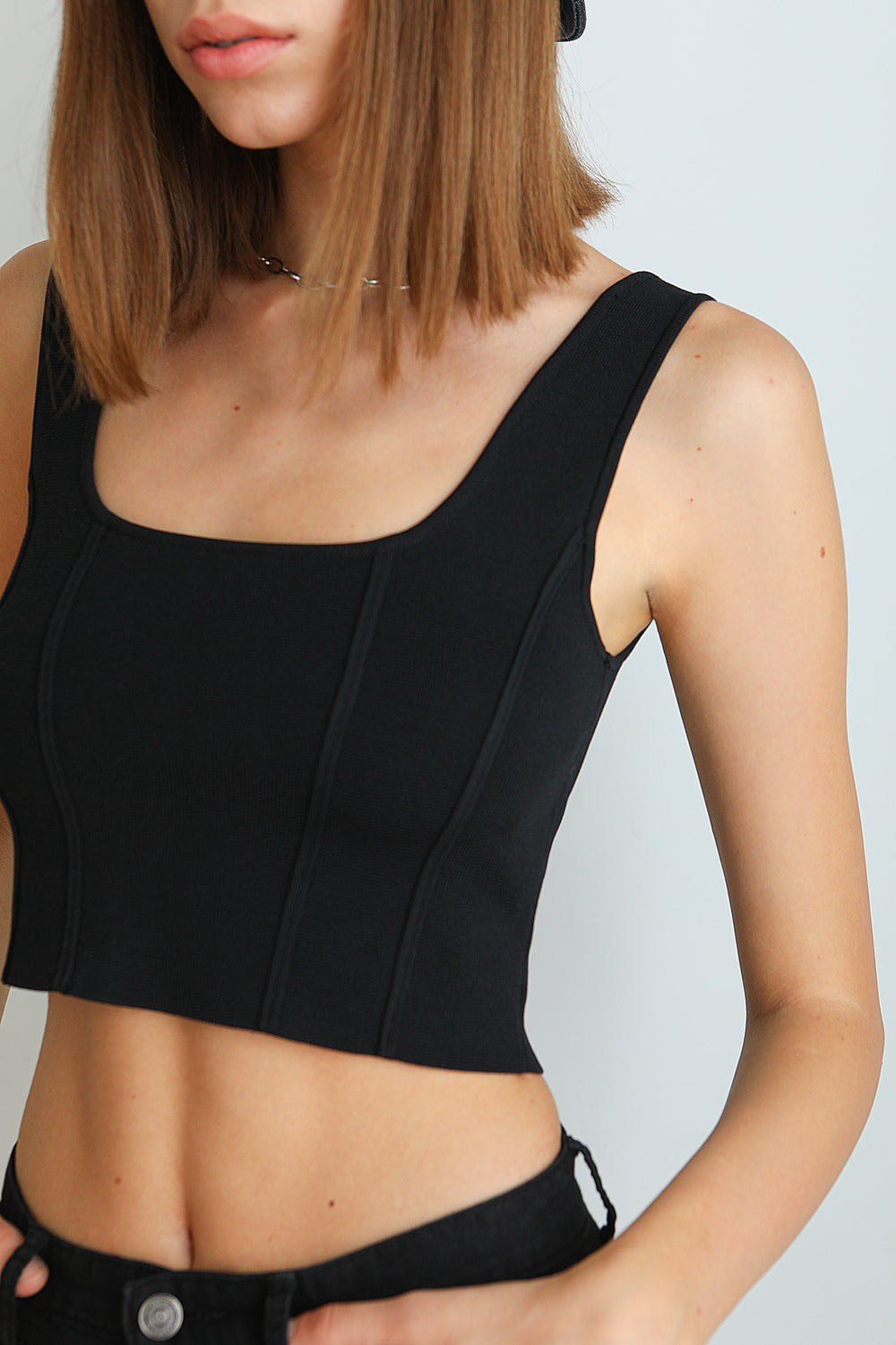 Our Small Talk tank has a corset-inspired bodice and vertical panels.