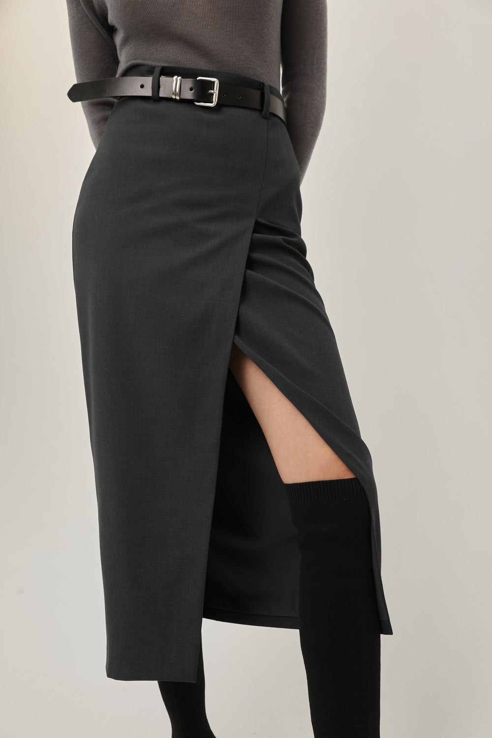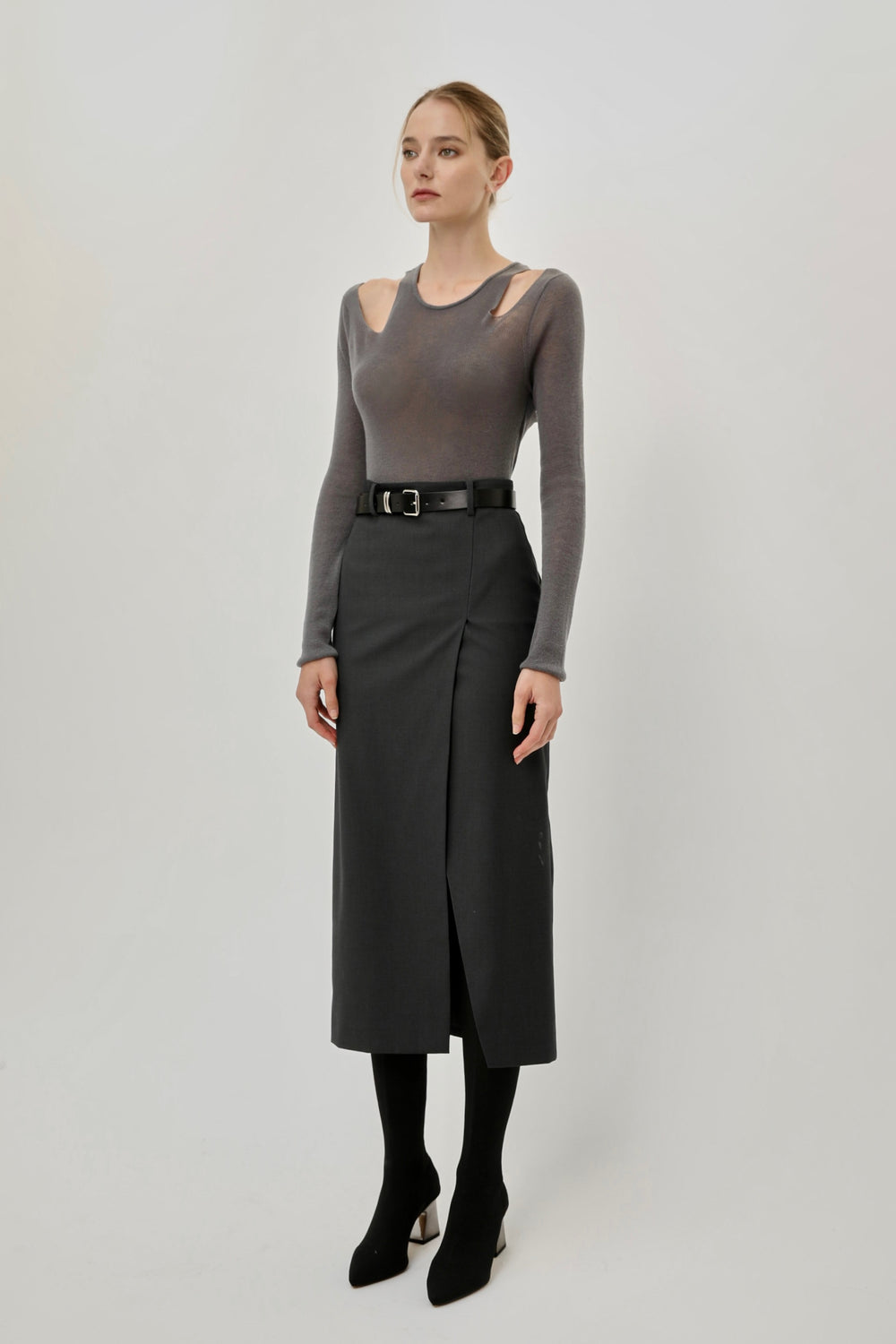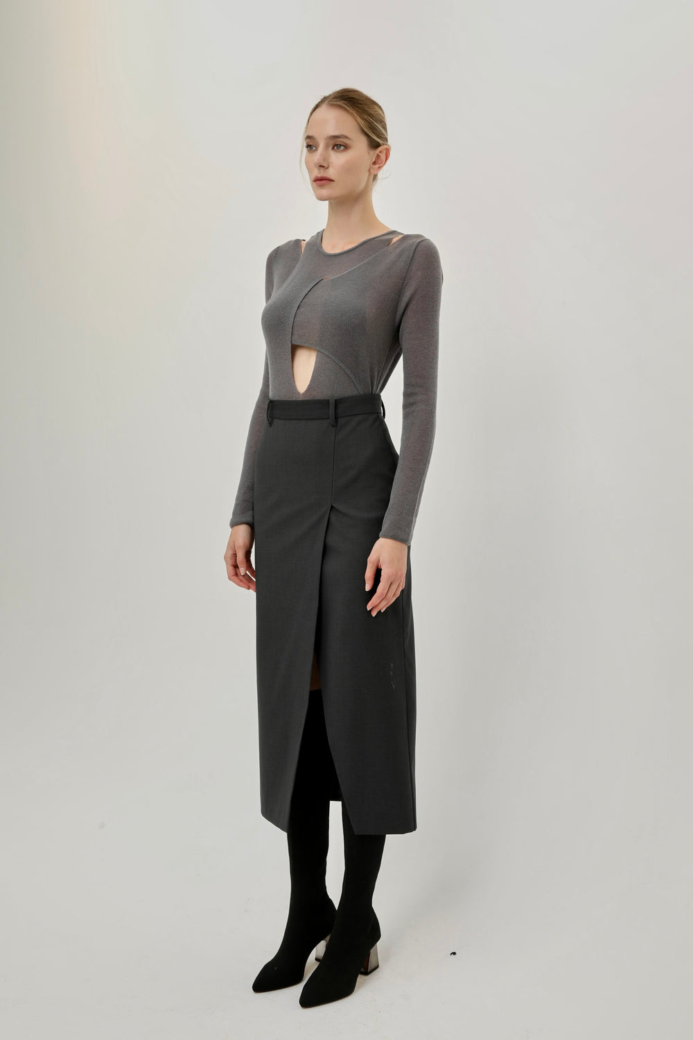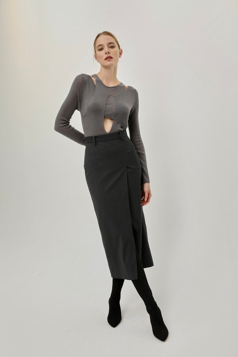 Inspired by the classic pencil styles, our Stimulation skirt falls in an elegant maxi length and a dramatic front split.