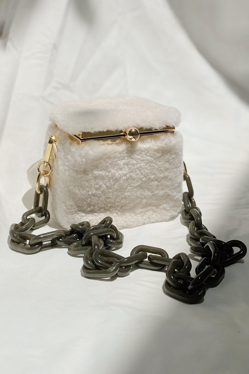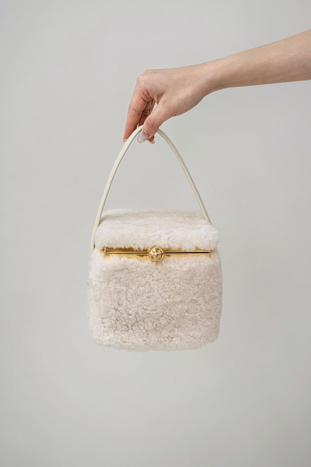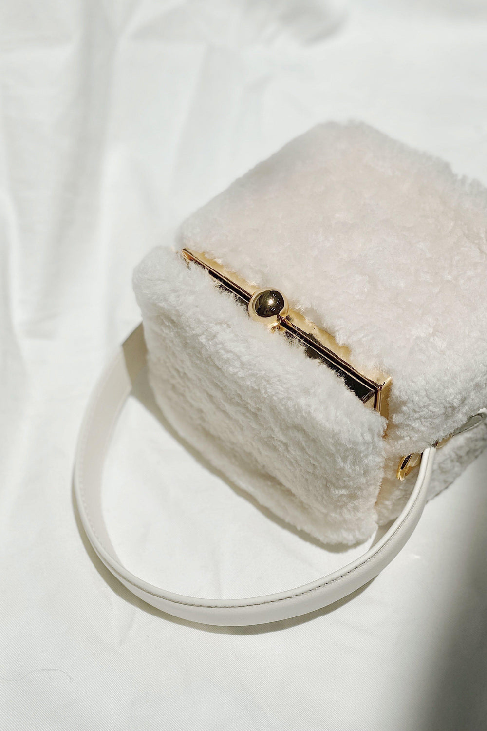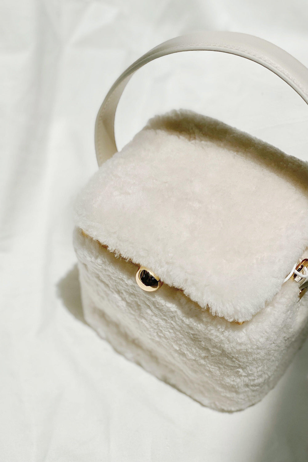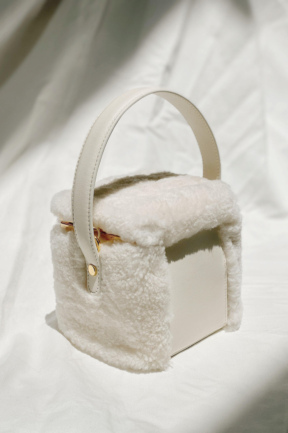 Our Teddy in a box bag is made from fluffy shearling and soft cow leather.