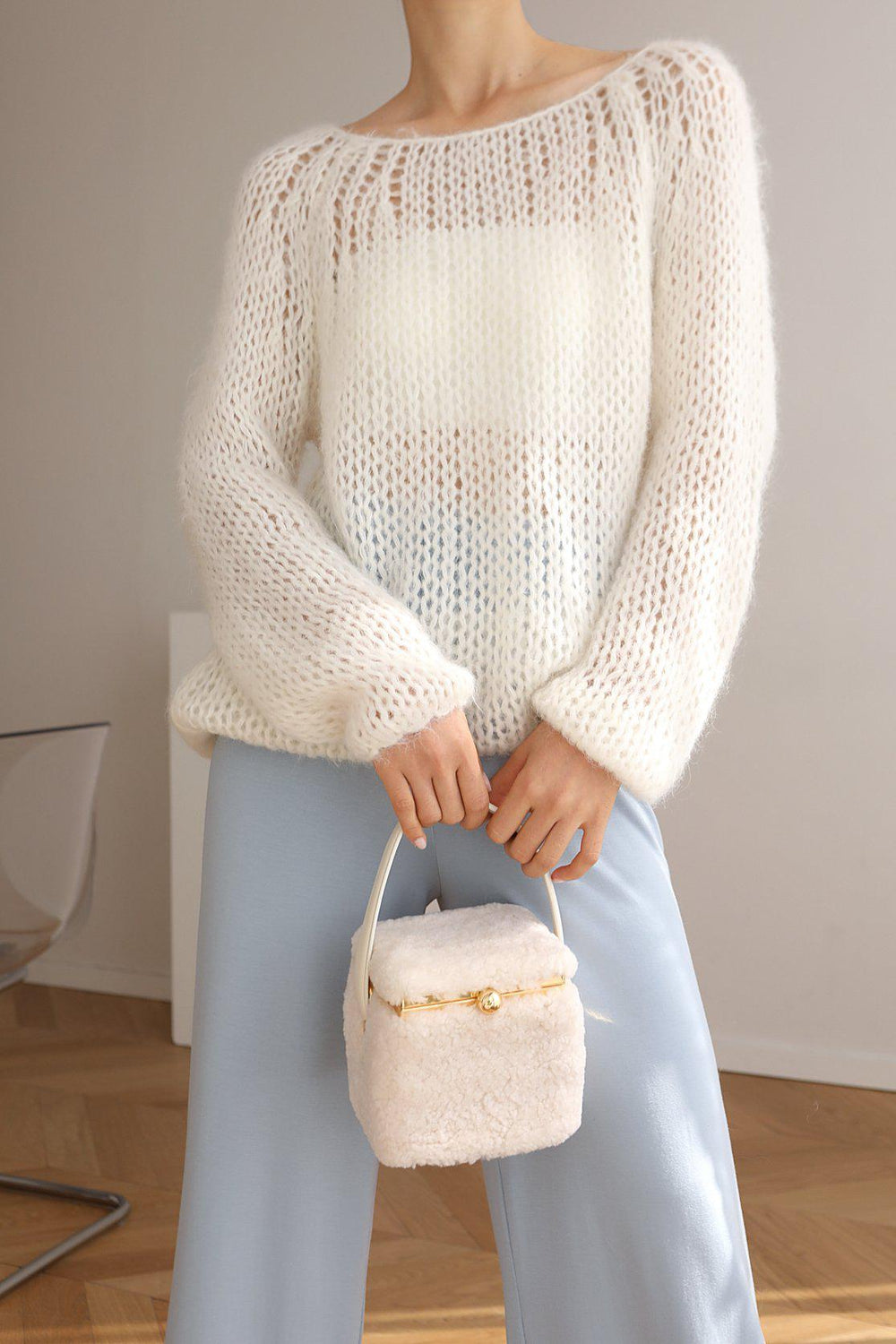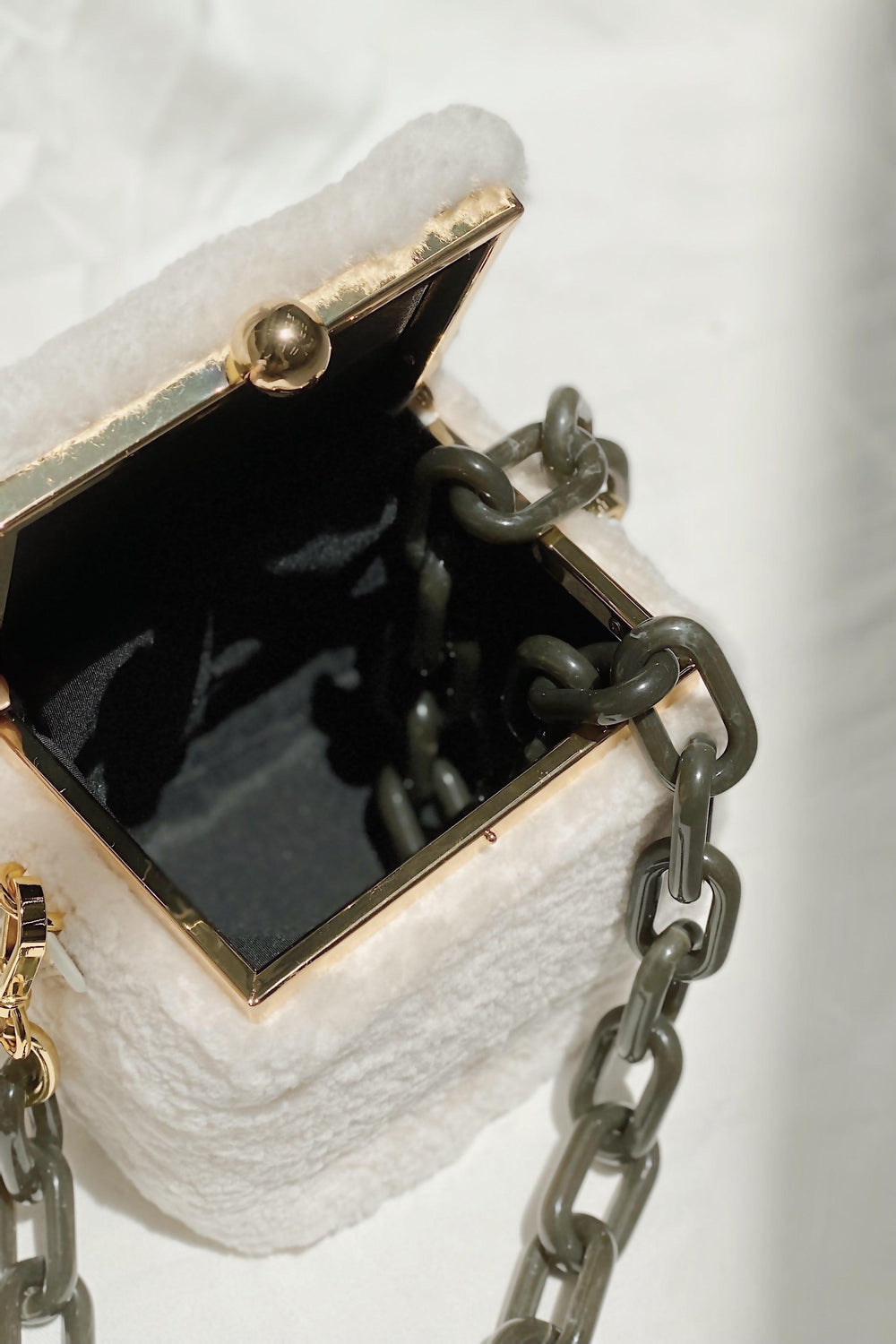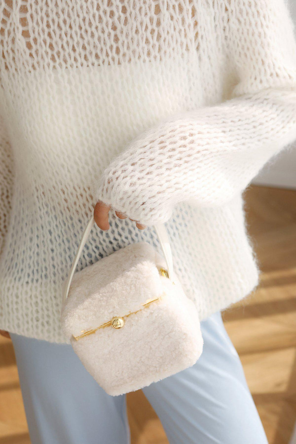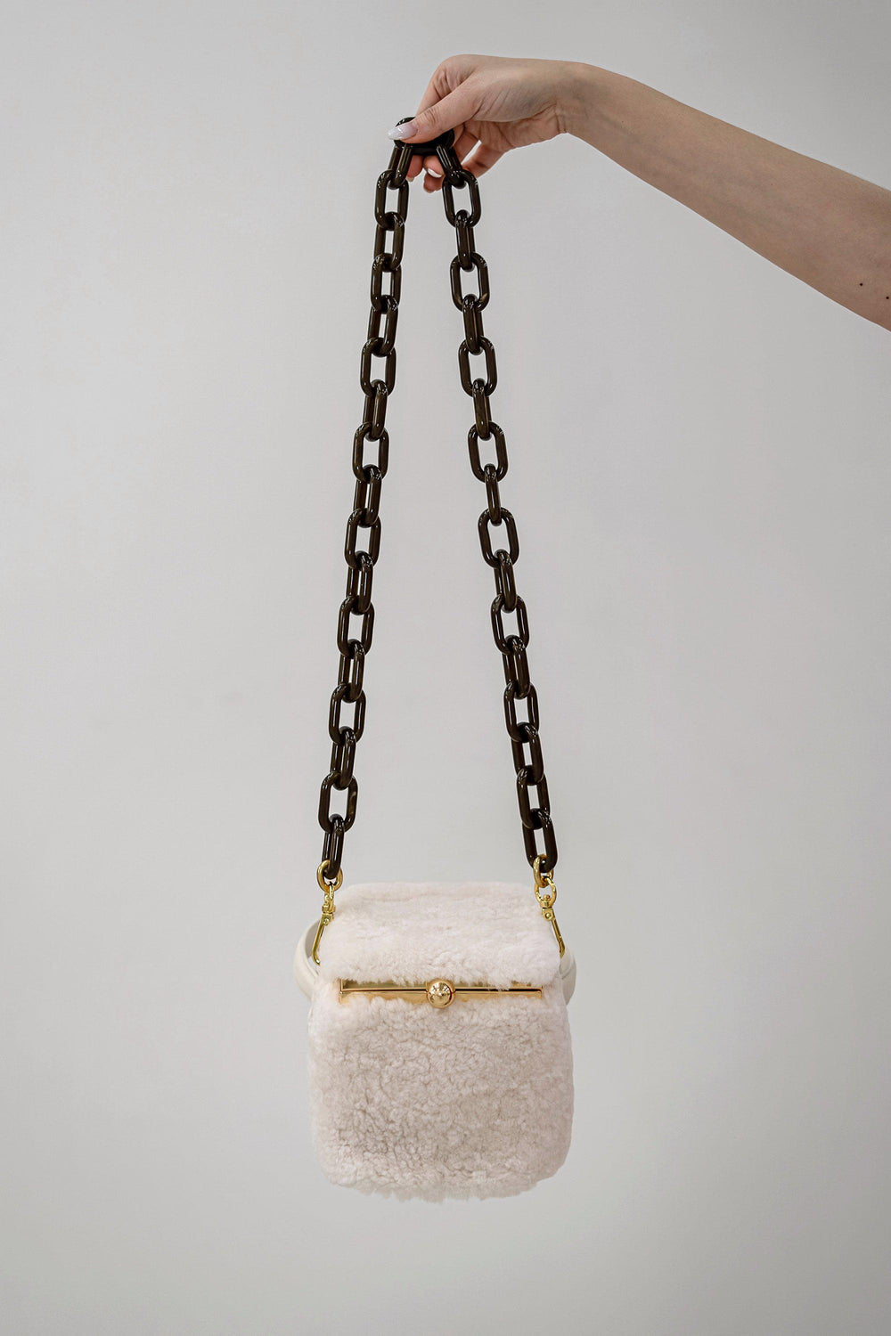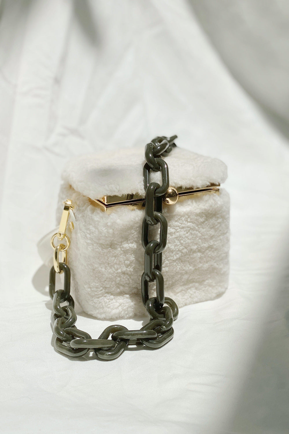 Our Teddy in a box bag is made from fluffy shearling and soft cow leather.