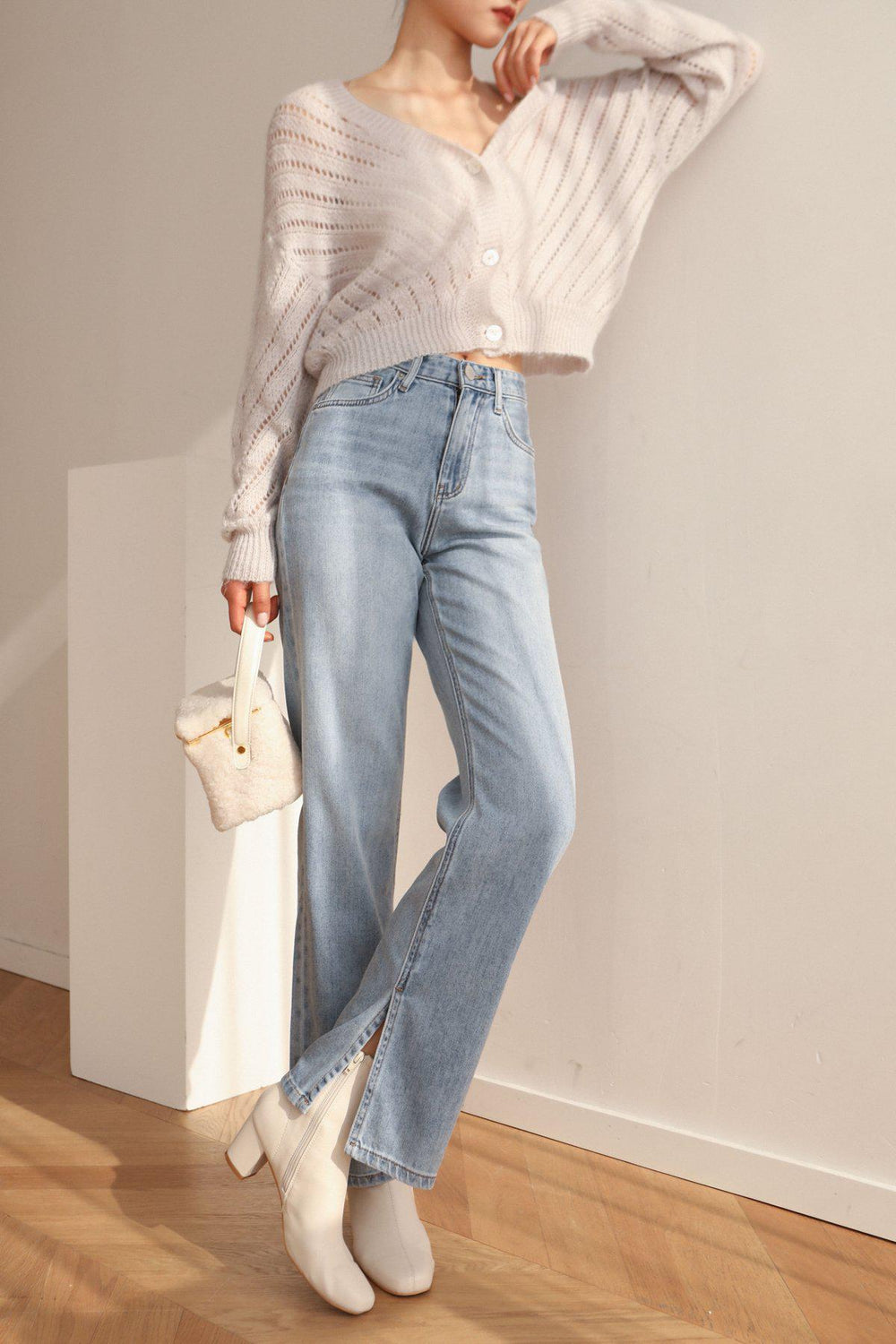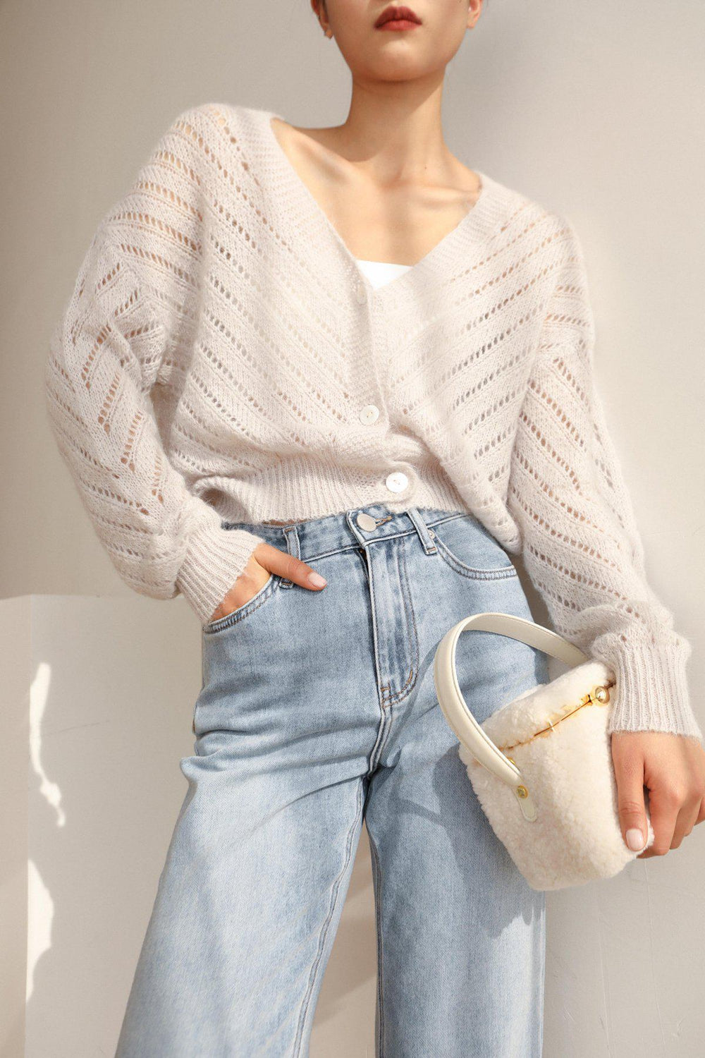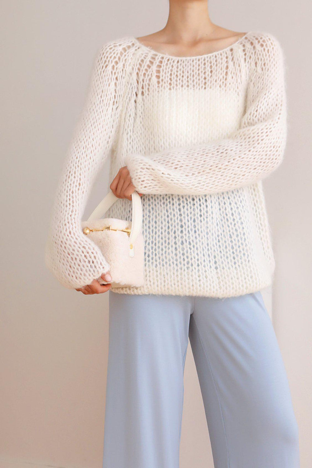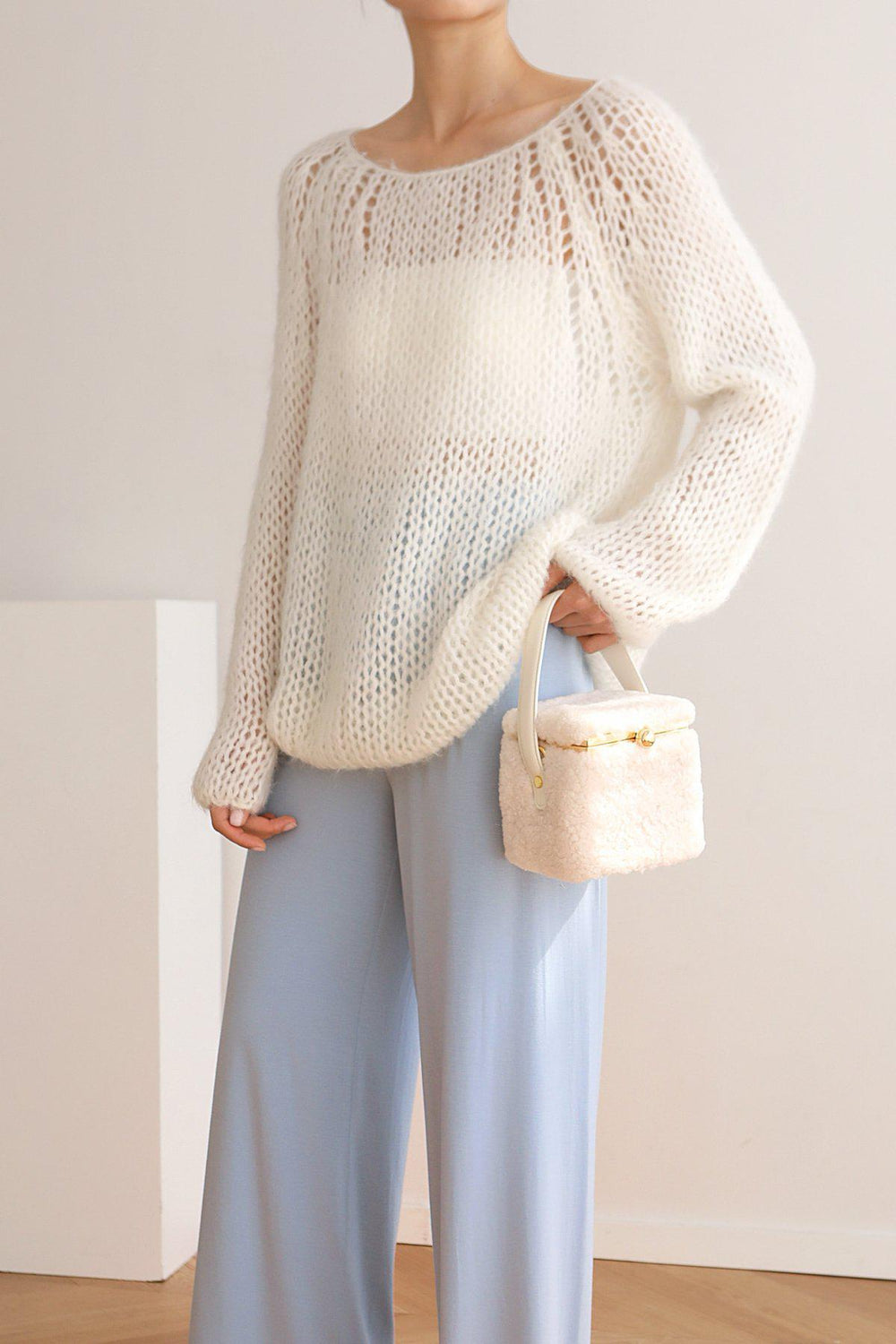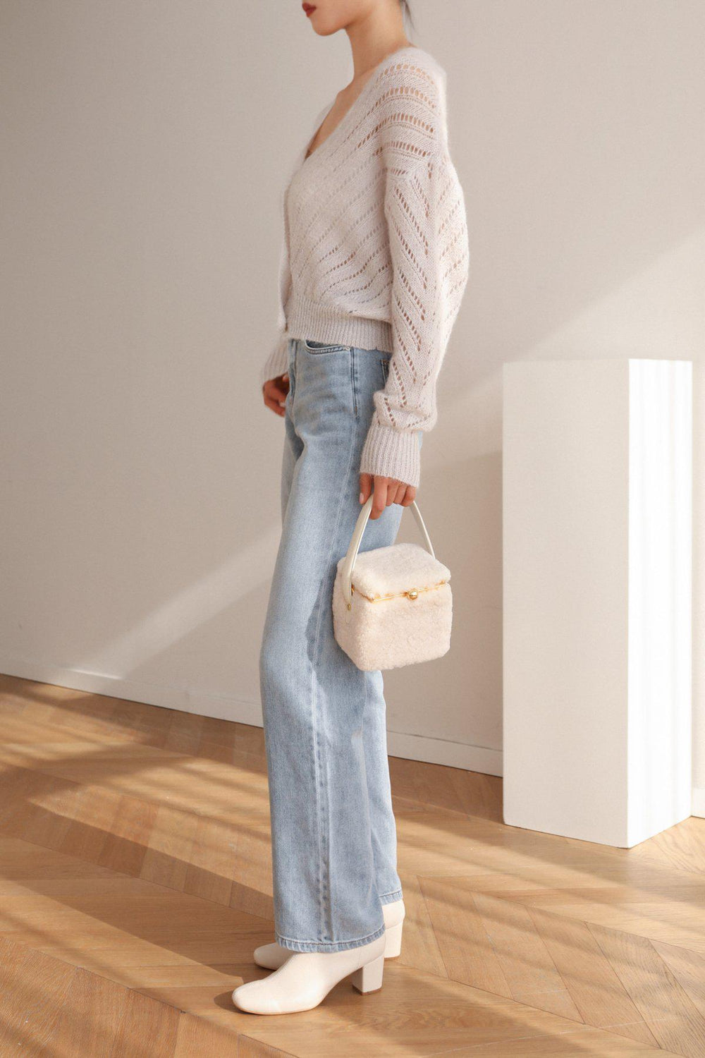 Our Teddy in a box bag is made from fluffy shearling and soft cow leather.