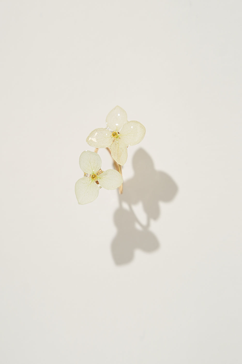 Crafted from 18K gold, this ring is tipped with dried hydrangea.