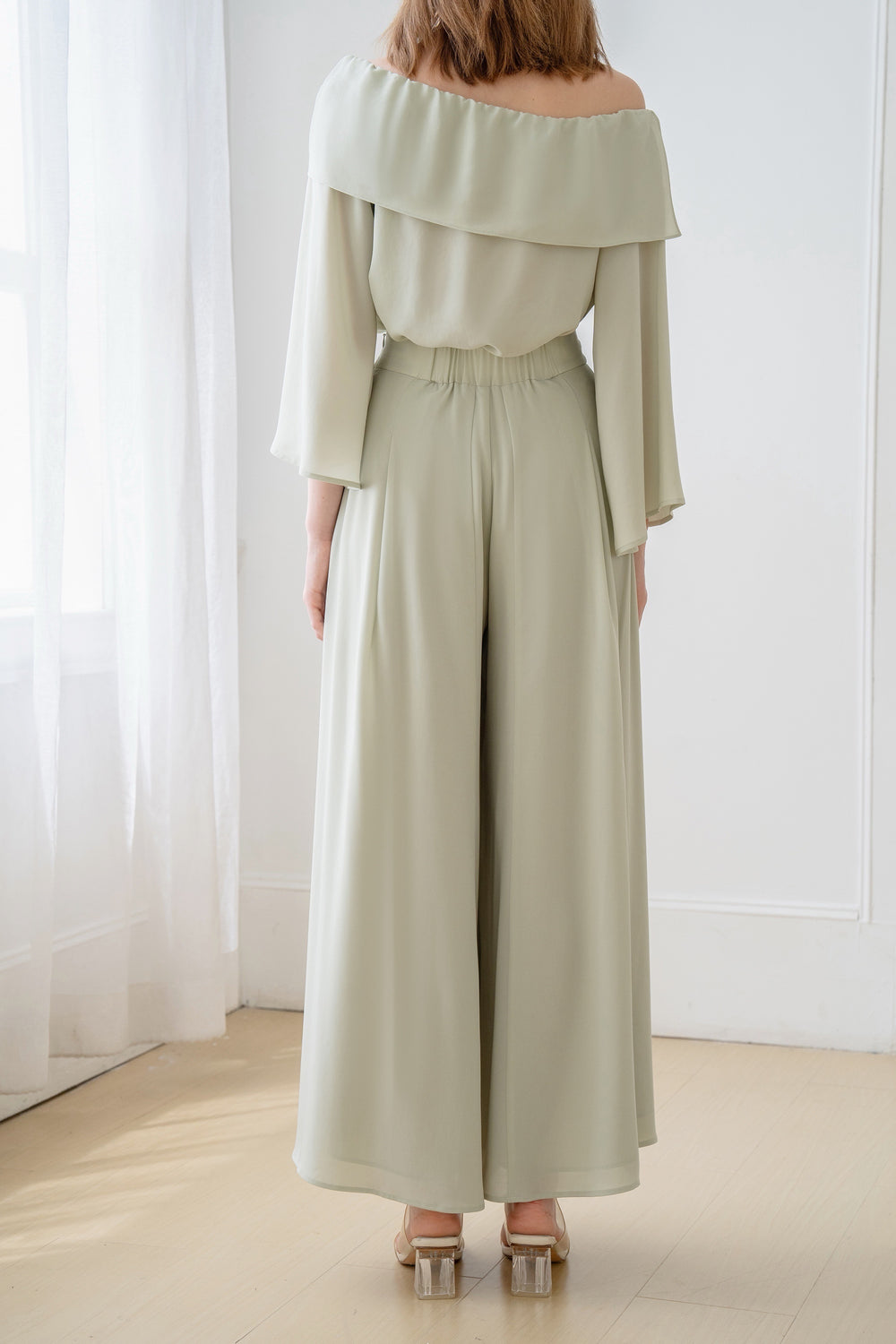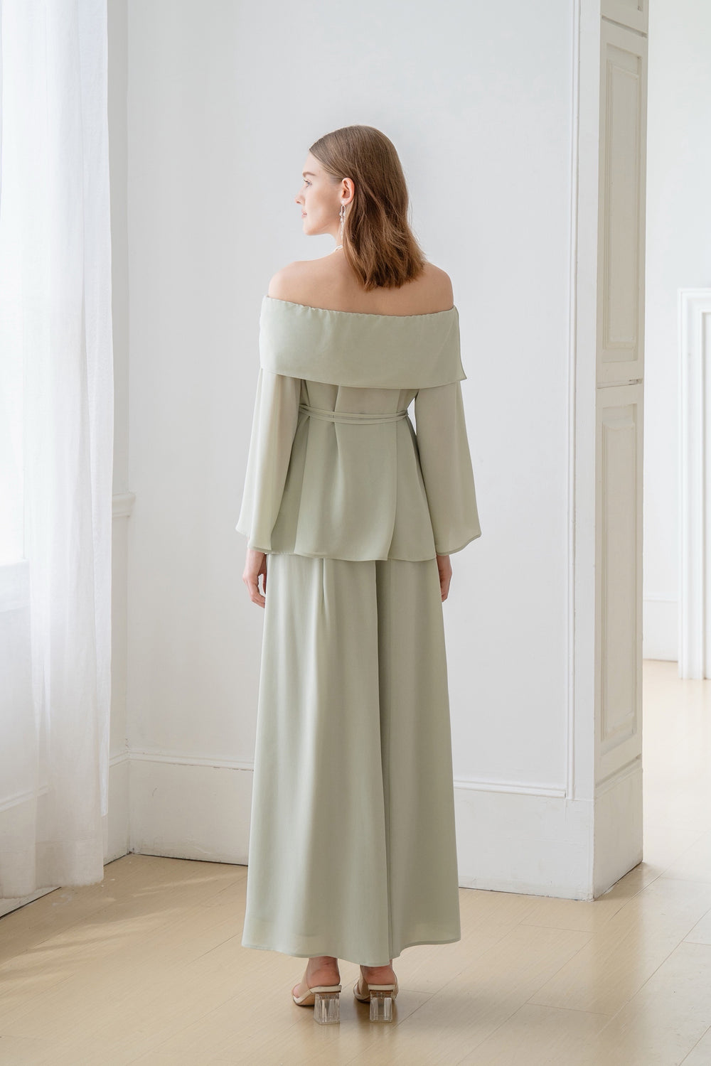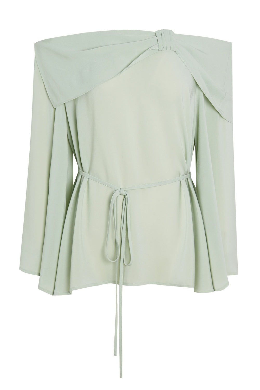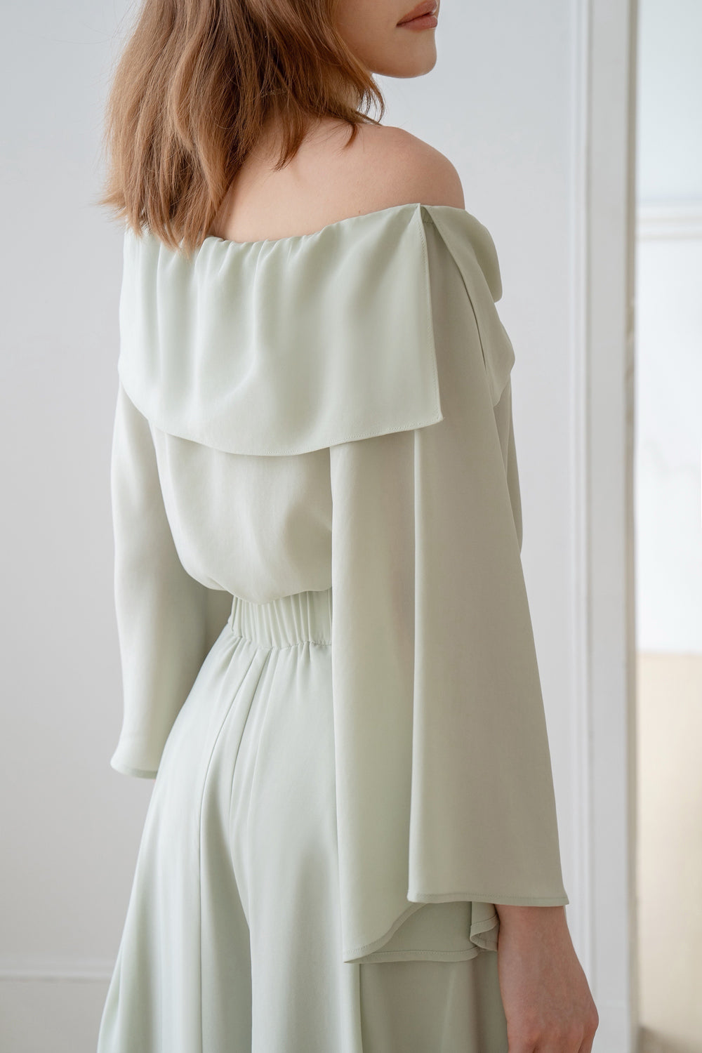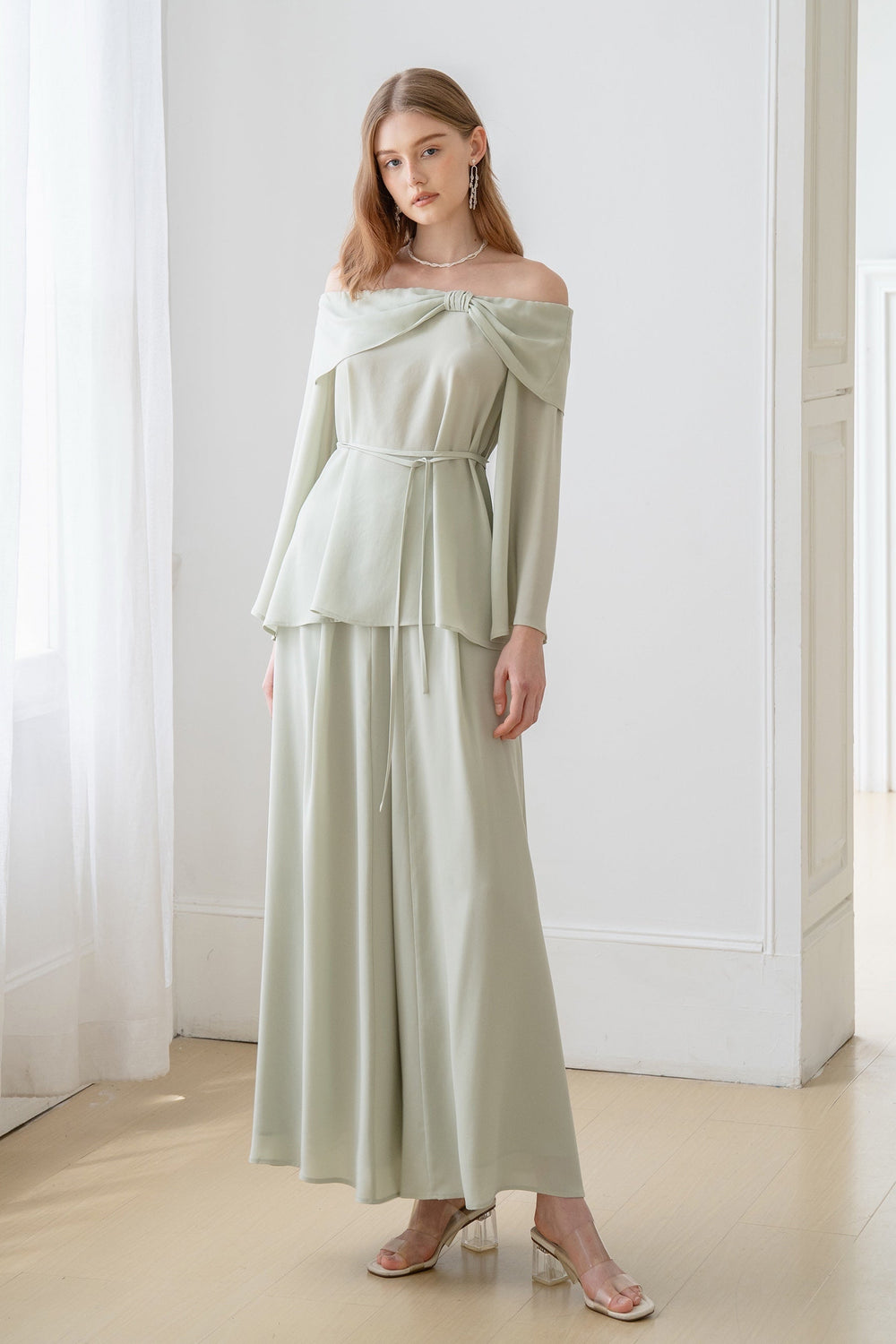 The blouse is detailed with a pretty bow and has an off-the-shoulder neckline.